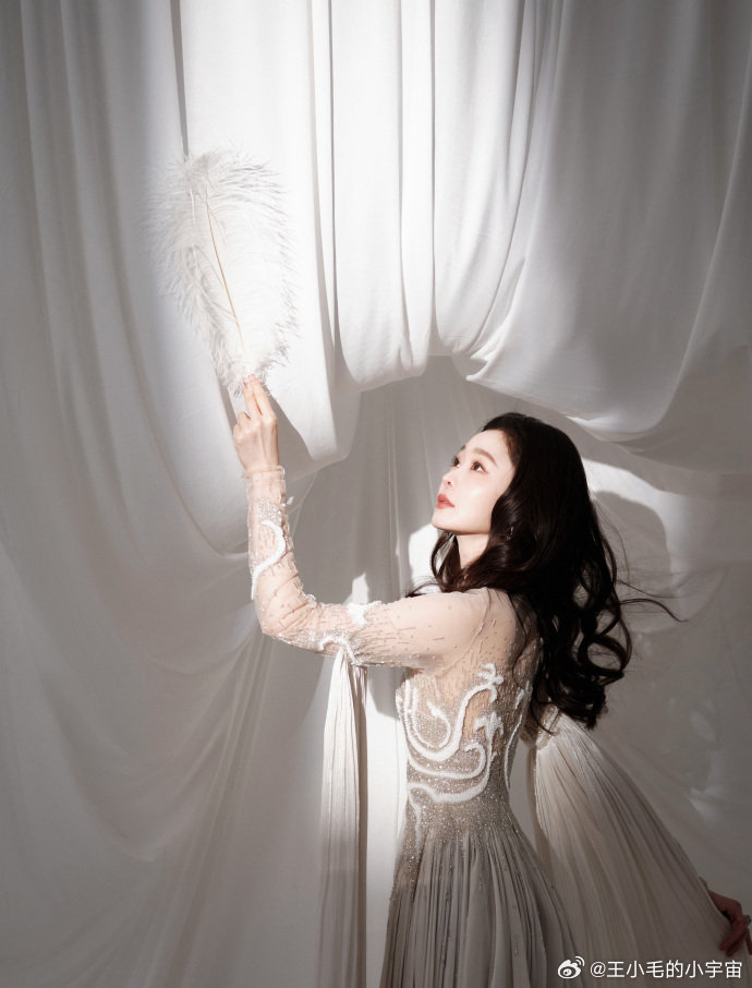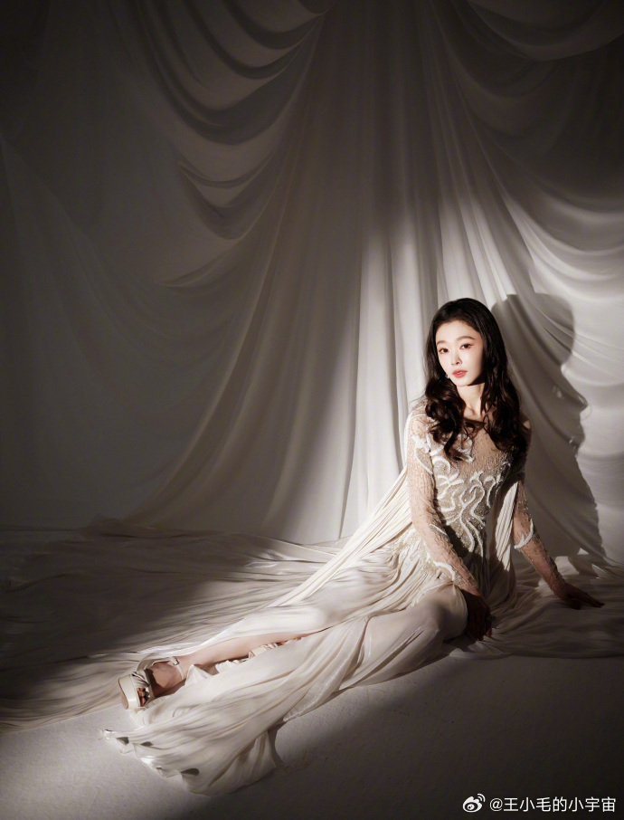 宋轶白裙羽毛头纱 划开时光的冰晶涟漪,羽毛定格温柔瞬间,白裙搭配羽毛头纱,层层堆