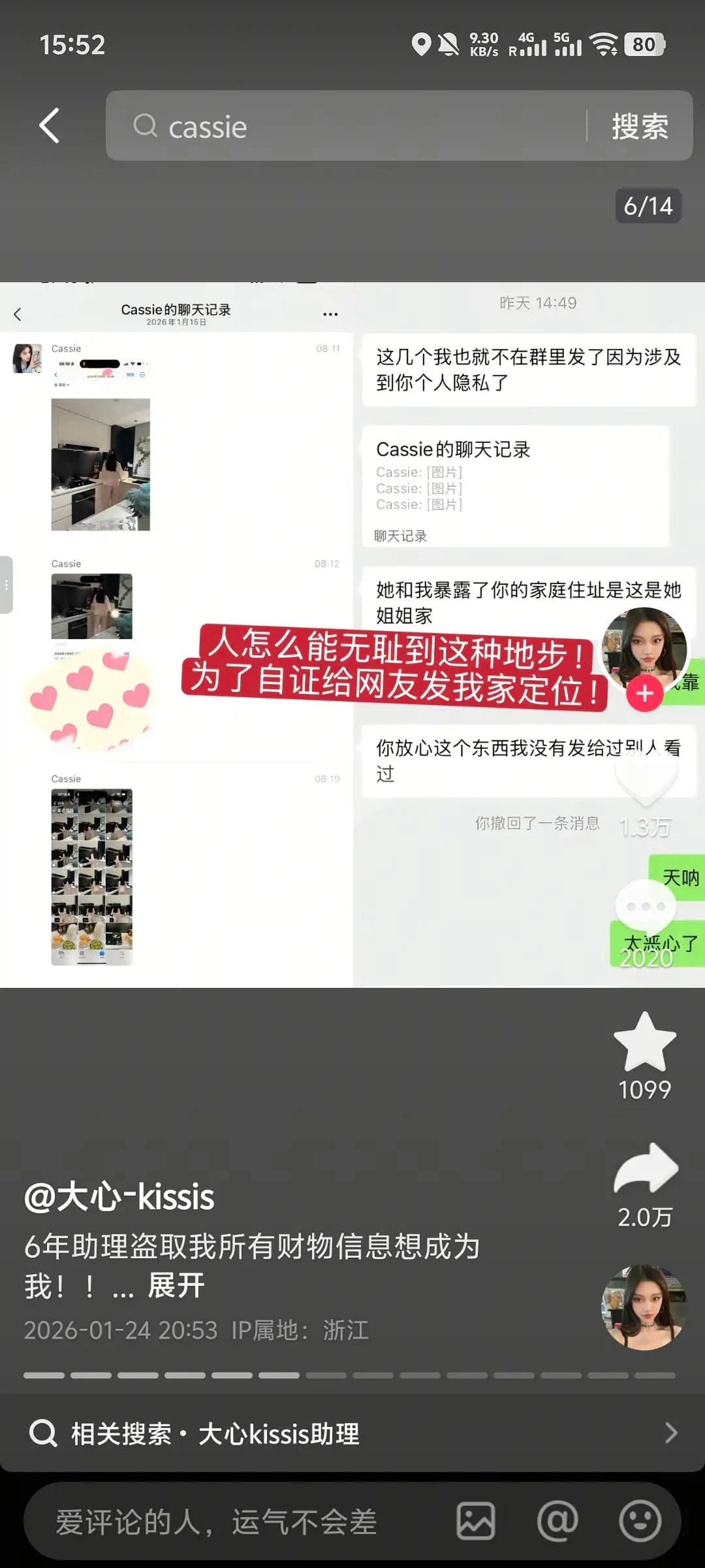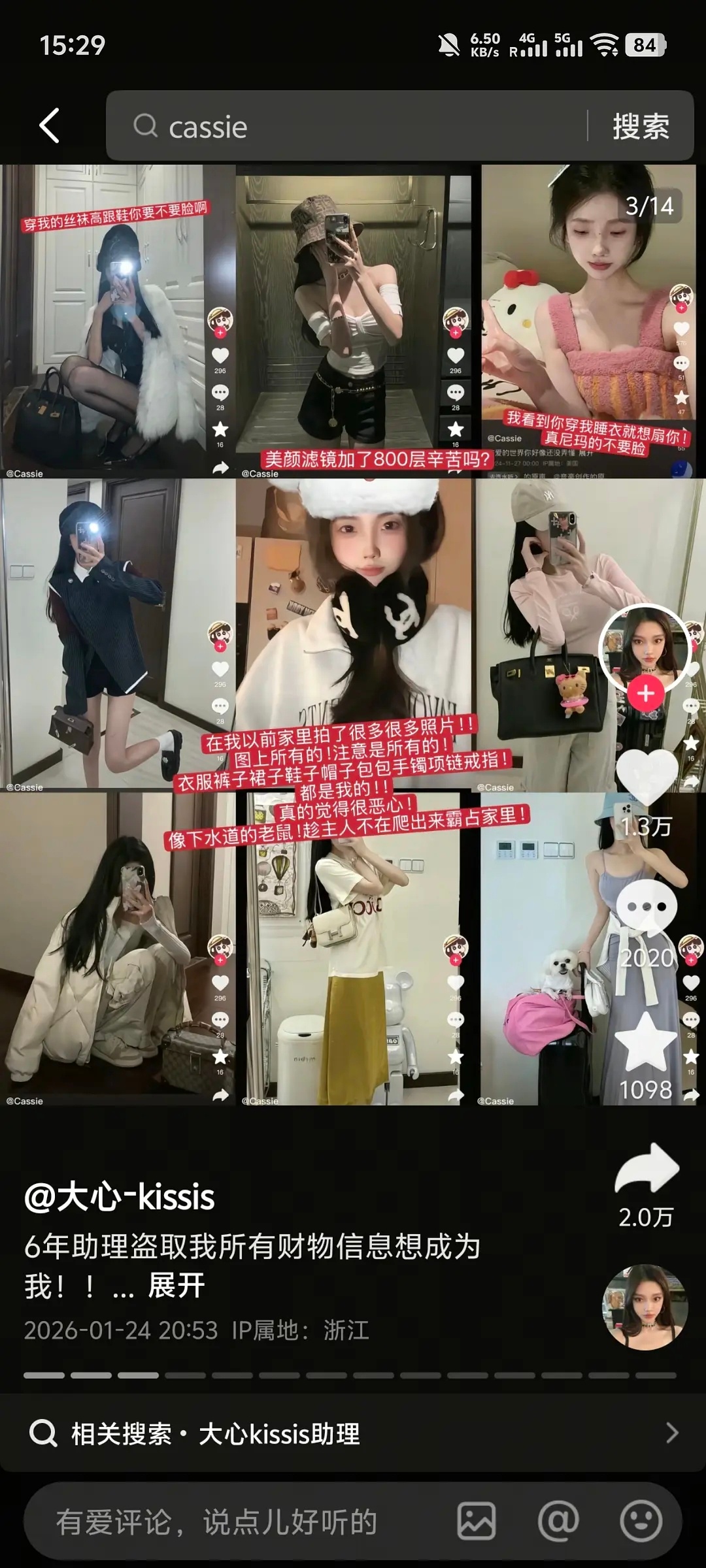 就是说什么六年前一个自称粉丝的人求助她借钱,她让人做了她助理,结果有天看私信说有个私密账号穿她衣服在她家拍照被怀疑还骗人说是她表妹,她才查出来原来助理(大概是24年开始)一直盗用她信息趁她不在家偷偷穿她衣服,还开抖音把平时的行程包装成自己的白富美人生形象(打造了新的虚假人设江浙沪富家女,哈佛医学院大四学生)吸粉赚钱啥的,甚至为了自证还给网友发了她家地址。。。