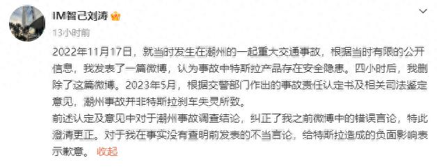 2022年11月17日,就当时发生在潮州的一起重大交通事故,根据当时有限的公开信息,我发表了一篇微博,认为事故中特斯拉产品存在安全隐患。四小时后,我删除了这篇微博。2023年5月,根据交警部门作出的事故责任认定书及相关司法鉴定意见,潮州事故并非特斯拉刹车失灵所致。