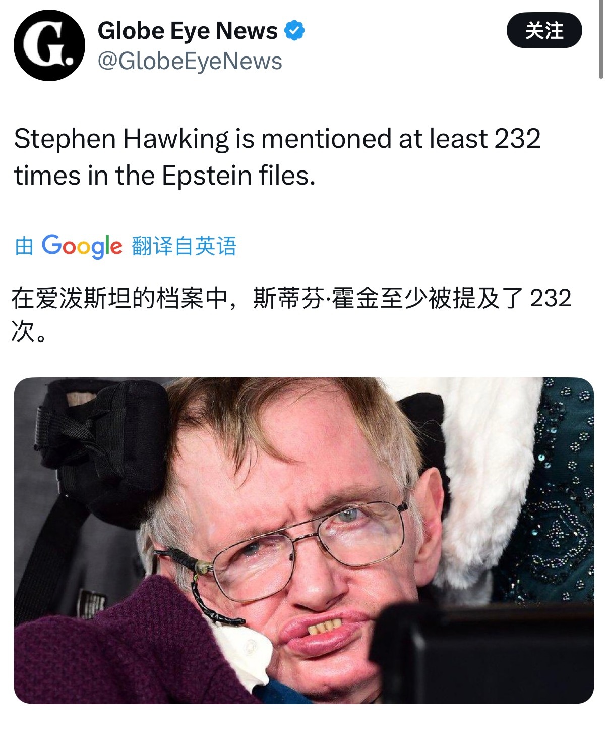霍金因为在爱泼斯坦文件中被提及232次引发外网热议