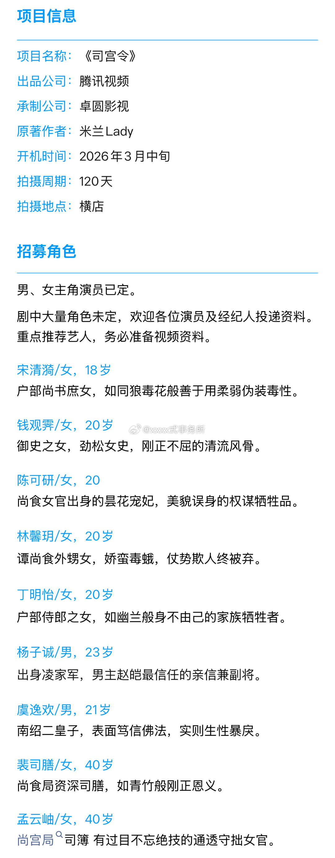 腾讯古装剧《司宫令》组讯,根据米兰lady同名小说改编主演:丁禹兮、宋祖儿3月中旬横店开机,拍摄周期120天
