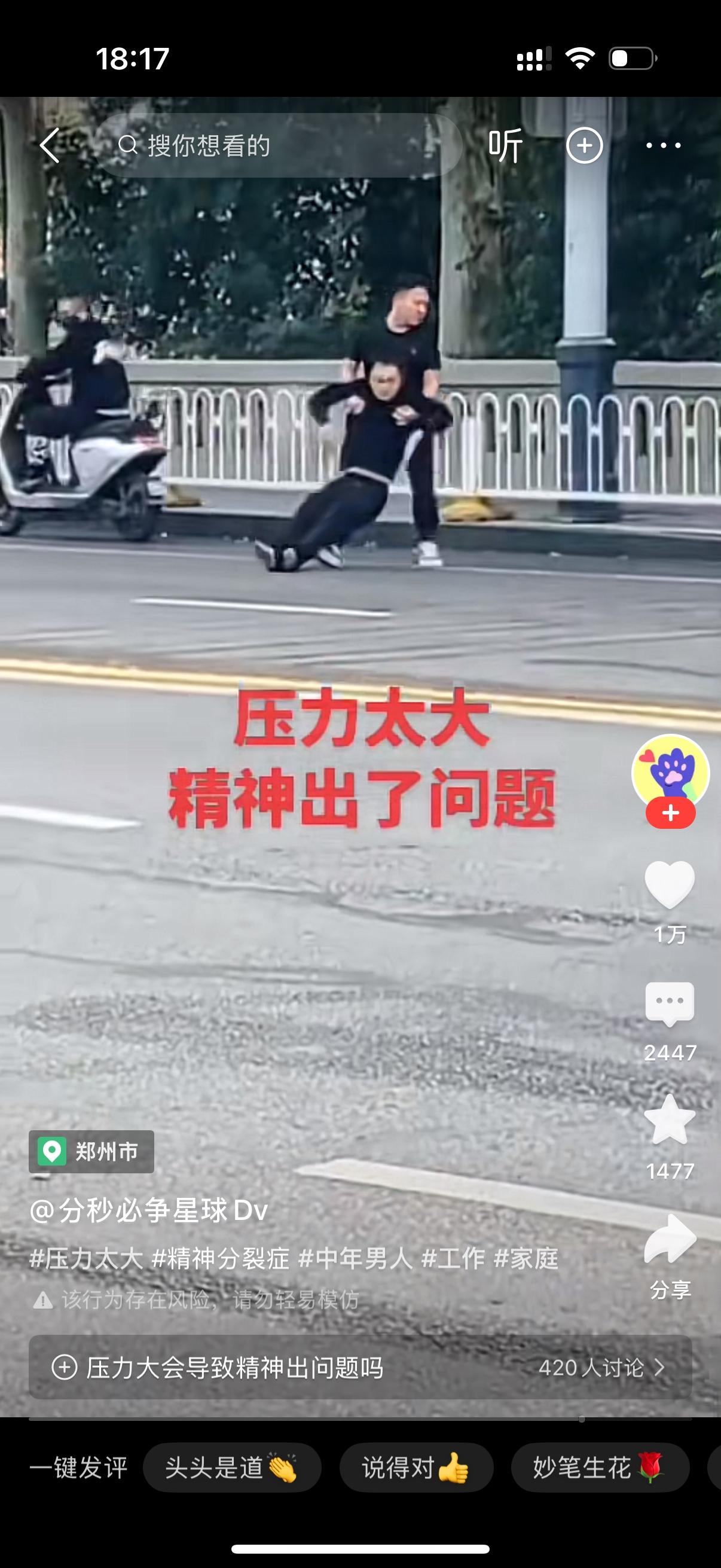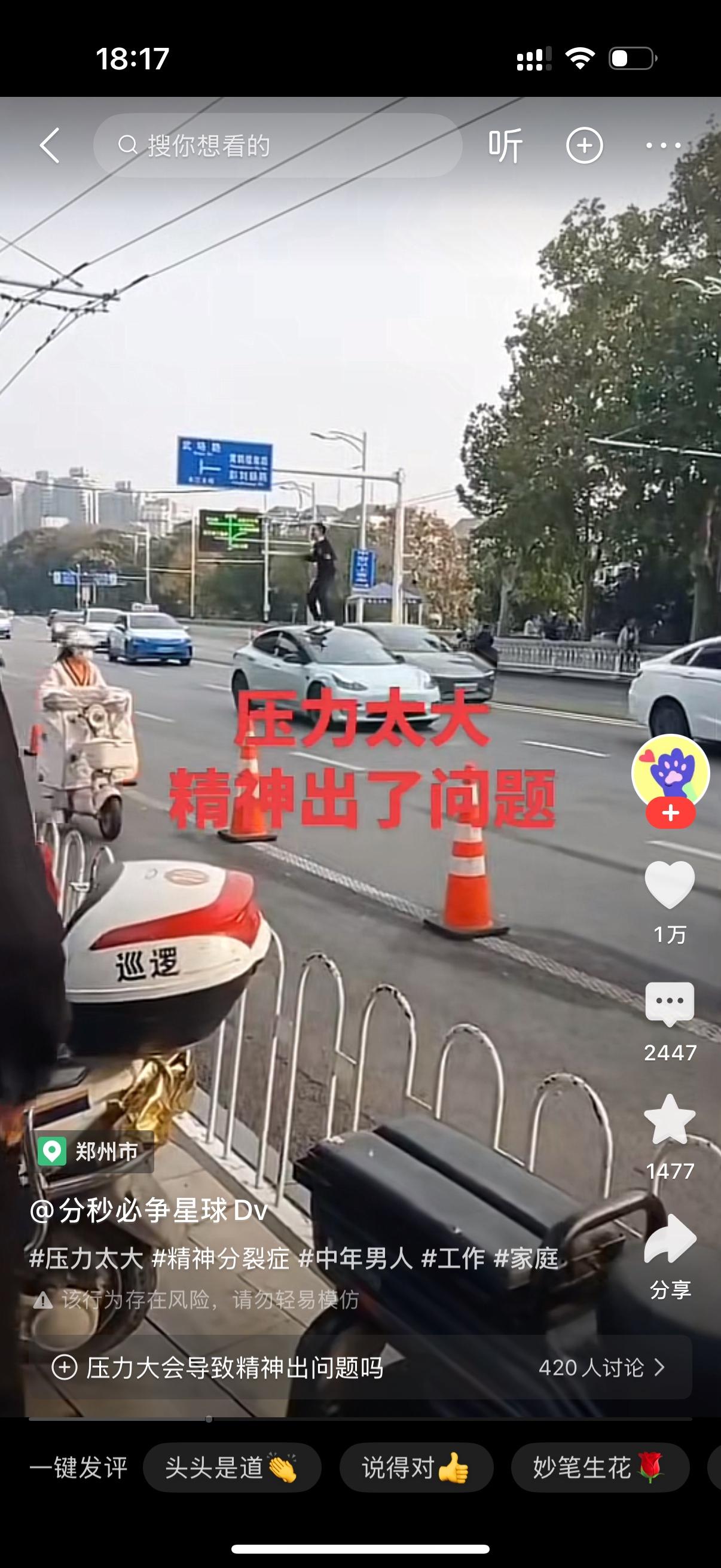 家人们刷到这个视频真的太戳心了,好好一个大男人,愣是被生活压力逼得精神出了问题,当街做出一连串让人看着鼻子发酸的举动。 他一开始还挺反常的,对着路上不认识的行人一个个毕恭毕敬敬礼,看着就跟平时不一样,明眼人都能看出来精神状态不对了。结果没隔一会儿,整个人直接彻底失控,疯了一样往车来车往的马路中间冲,不管不顾地伸手拦车,把过往司机吓得赶紧急刹车,太危险了。 情绪上头到极点,他还直接爬上去一辆汽车,在车顶上又蹦又跳,又喊又叫的,完全是被压力压到崩溃的样子。旁边路人都不敢上前,最后还是家属拼了命冲上去,连拉带拽才把他从车上弄下来,拖回路边安全的地方。 说真的,看着特别唏嘘,谁也不想变成这样,肯定是肩上的担子太重,压力攒到顶再也扛不住了,才会精神失常当街失态。成年人的世界哪有容易二字,崩溃真的就在一瞬间。也希望这位大哥能赶紧得到专业的治疗,早点好起来,也希望咱们负重前行的时候,都能找对出口疏解压力,千万别把自己逼到这一步啊。