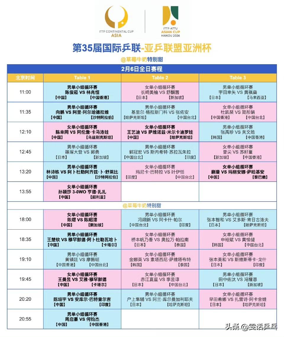 2月6日全日赛程【P2】 11:00 T1 陈俊菘🇨🇳VS林兆恒🇭🇰 11:35 T1 向鹏🇨🇳VS阿里·阿尔哈德拉维🇸🇦 12:10 T1 陈幸同🇨🇳VS阿伦詹·卡马洛娃🇺🇿 12:10 T2 王艺迪🇨🇳VS萨维诺兹·米尔卡迪罗娃🇰🇿 13:20 T1 林诗栋🇨🇳VS阿卜杜勒阿齐兹·卜·舒莱比🇸🇦 13:20 T3 蒯曼🇨🇳VS玛丽安娜·萨哈基安🇱🇧 13:55 T1 孙颖莎🇨🇳3-0WO亨德·扎扎🇸🇾 18:00 T1 陈熠🇨🇳VS陈昭澐🇸🇬 18:35 T1 王楚钦🇨🇳VS穆罕默德·阿卜杜勒瓦哈卜🇶🇦 19:45 T1 王曼昱🇨🇳VS艾雅·穆罕默德🇶🇦 20:20 T1 陈垣宇🇨🇳VS安库尔·巴特查尔吉🇮🇳 20:55 T1 周启豪🇨🇳VS何钧杰🇭🇰