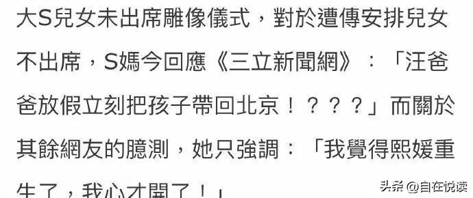 谁有S妈的电话 谁有S妈的电话 谁有S妈的电话 真想规劝她一句 冤冤相报何时了 而且自从汪徐两家反目后 汪小菲到现在都没“越界” 就是跟大S在网上互撕时 他也一直说的是 希望两个孩子放假时回北京 如今大S走了一年了 他依旧守着这条底线 暑假带孩子看遍内地风景 寒假又带着孩子吃吃喝喝逛逛 一到开学马上送回湾湾生活 这样的做法还不够尊重逝者么 结果S妈还不满足 张嘴就说 一放假汪爸爸就把孩子带走了 那是你闺女的孩子 人家也是孩子的亲爹呀 退一万步讲 你这外婆如果有半点把孩子放在心上 孩子亲爹也不会对你不理不睬 事情到了如今这步 再闹下去晚节不保 还可能会影响mini大小S的星途