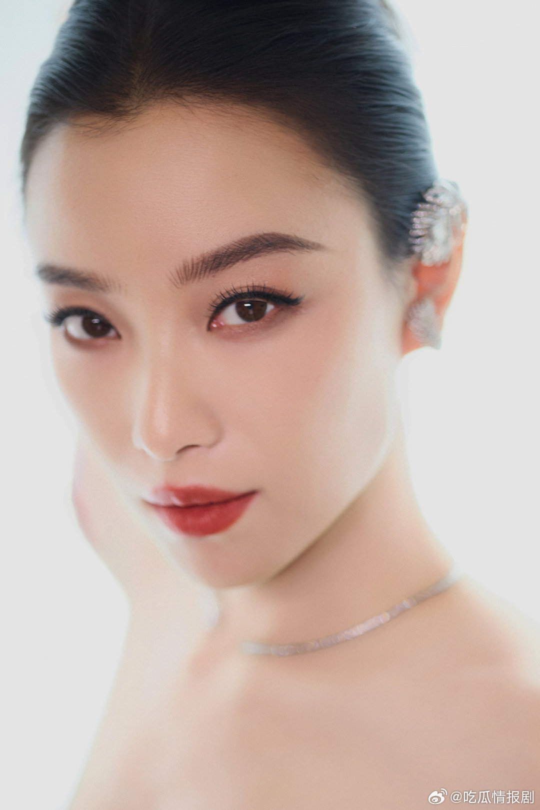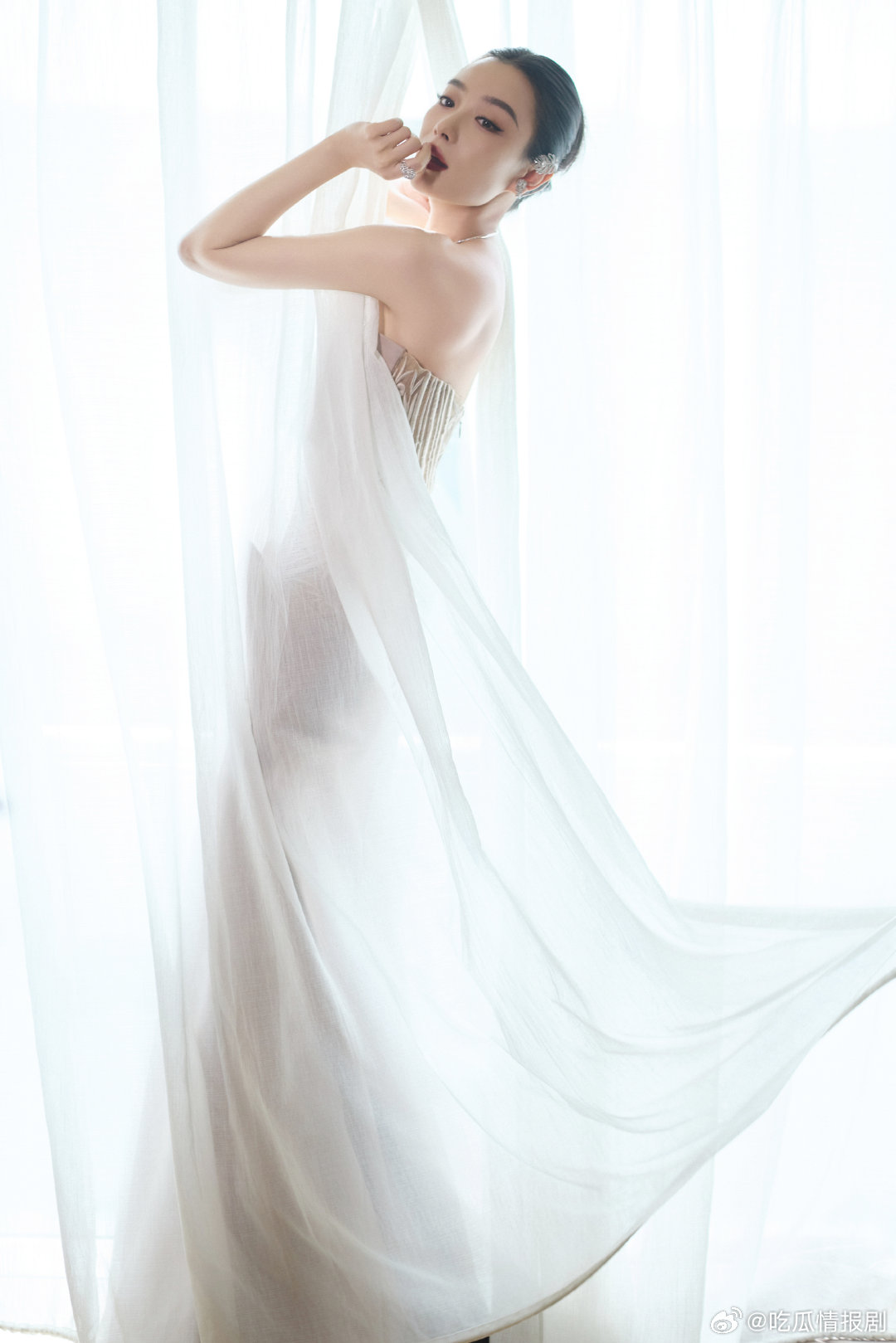 倪妮 大光明大红唇的杀伤力 一袭裸粉缎面鱼尾裙,如晨曦初照的云霞,轻柔却不失力量。她以最沉静的姿态走上红毯,却掀起最汹涌的视线浪潮。肩颈线条如雕塑般完美,鱼尾裙摆拖曳出优雅弧度。而那抹大红唇,是她灵魂的火种,点燃了整个夜晚。