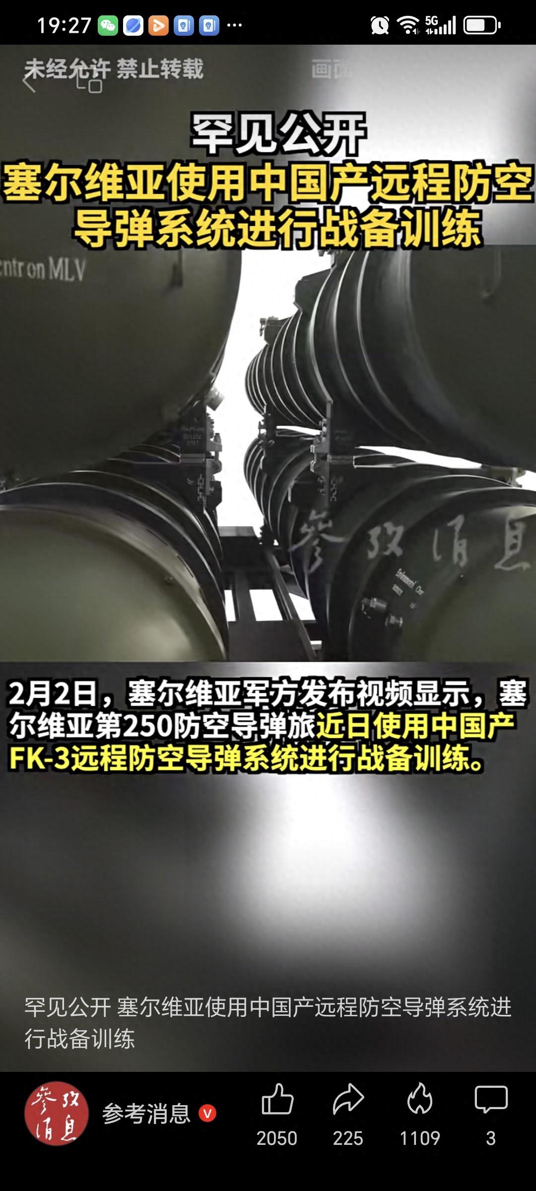 罕见!塞尔维亚使用“红旗-22”进行战备训练,展示塞武装有能力保卫自己的天空。 2月2日,塞尔维亚军方展示塞尔维亚第250防空旅使用中国产FK-3远程防空导弹系统(红旗-22出口型)进行战备训练,训练内容包括导弹装填、对空警戒等多课目。这次演练意在向外界释放信号:塞尔维亚正在用中国的力量保卫塞尔维亚的领空。 塞尔维亚第250防空旅是塞尔维亚的英雄部队,在1999年北约侵犯南斯拉夫,美国的F-117A隐形战斗机是被塞尔维亚第250防空导弹旅的萨姆-3防空导弹所击落,被认为是人类防空作战史上的奇迹,美国F-117A隐形战斗机,则是世界第一款投入实战应用的隐形飞机。战斗机残骸现收藏于贝尔格莱德航空博物馆。 “英雄部队+红旗”展现了塞尔维亚保卫领土的决心,军事演习意在传递信号:中塞“兄弟情谊”牢不可破,塞尔维亚正在以实际行动和中国进行军事合作,以更好的守卫塞尔维亚。