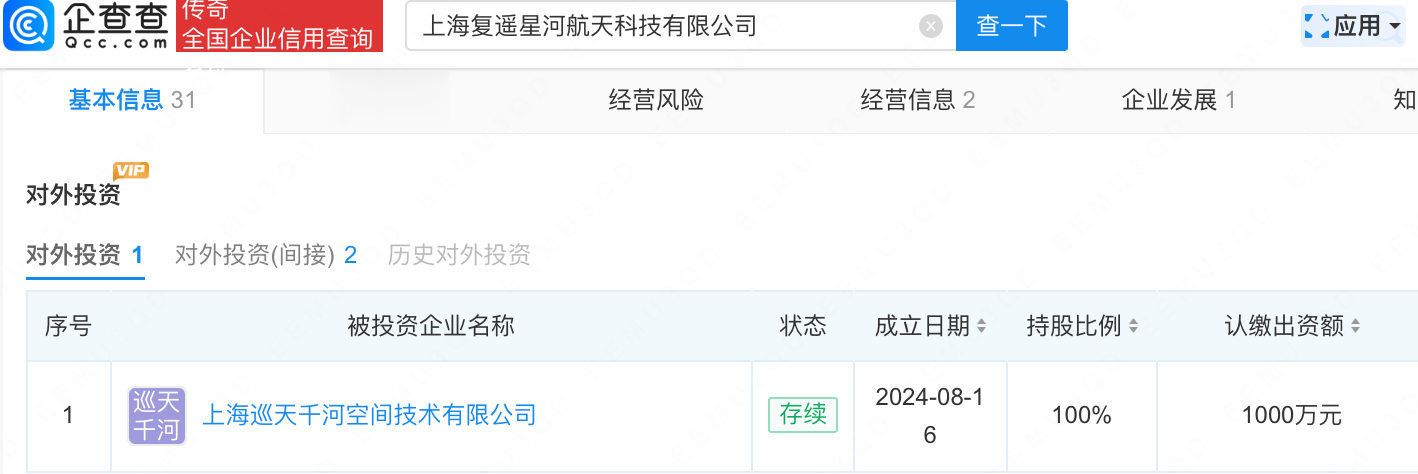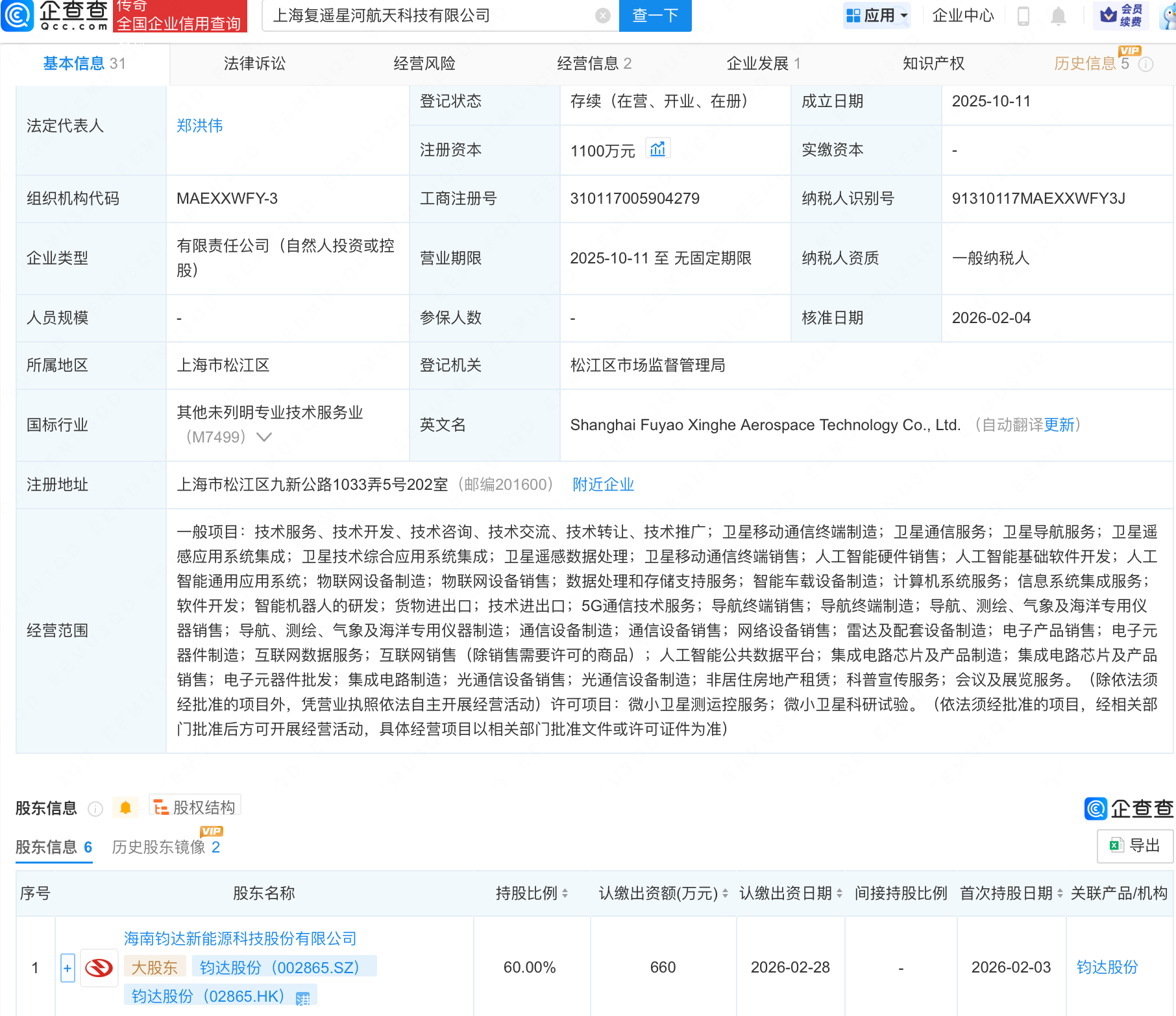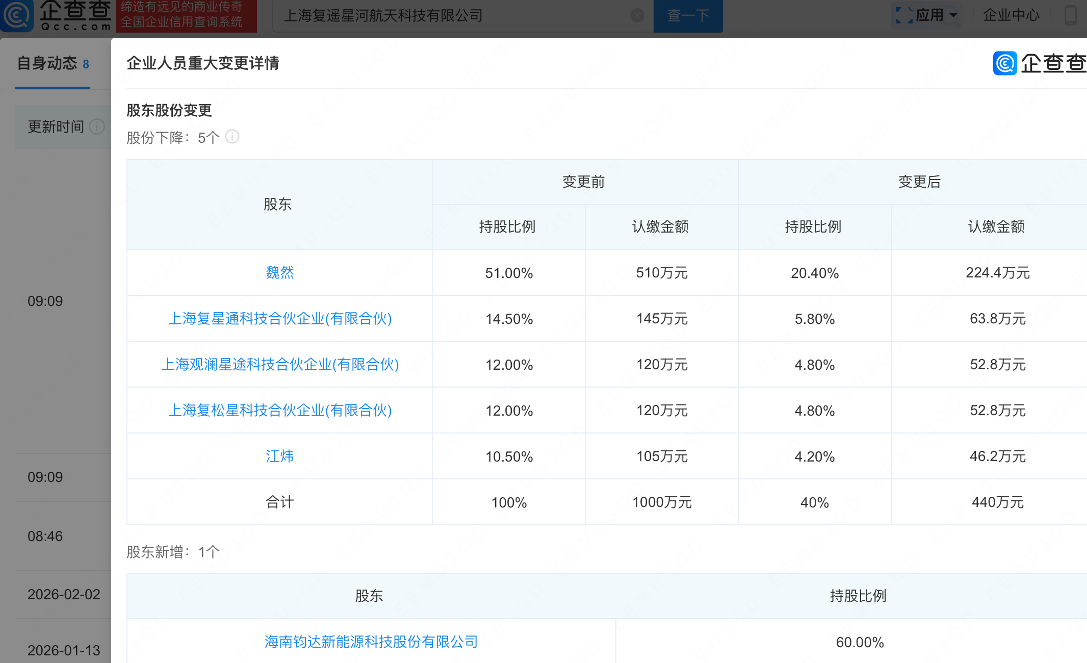 企查查APP显示,近日,上海复遥星河航天科技有限公司发生工商变更,多名股东股份下降,新增钧达股份(002865.SZ)为大股东,持股60%,同时注册资本增至1100万元。企查查信息显示,该公司成立于2025年10月,经营范围包含:卫星遥感应用系统集成;卫星技术综合应用系统集成;卫星遥感数据处理;卫星移动通信终端销售等,其全资控股上海巡天千河空间技术有限公司。