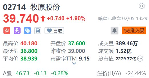 格隆汇2月5日|“全球第一大生猪养殖企业”牧原股份(2714.HK)将于明日(2月6日)在港上市,富途行情显示,该股暗盘段收报39.74港元,较招股价39港元涨1.9%,每手100股,不计手续费,一手赚74港元。