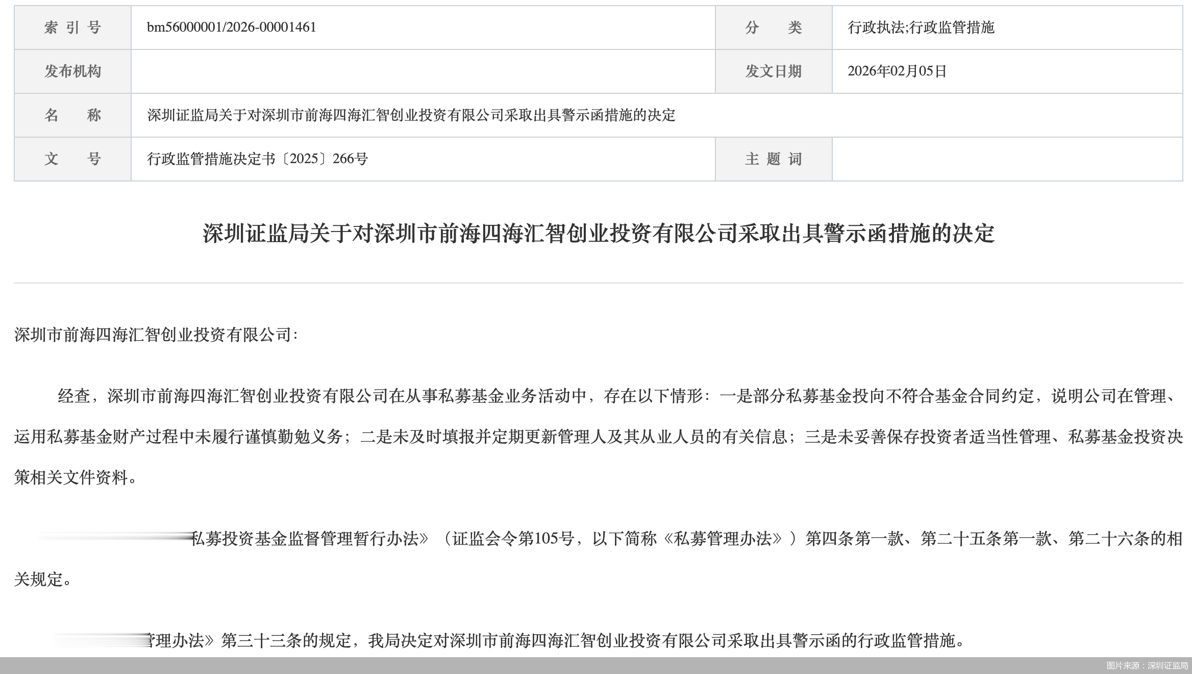 深圳证监局指出,上述行为违反了相关规定,决定对前海四海汇智创投采取出具警示函的行政监管措施。