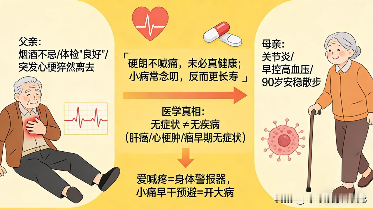 退休后,我目睹了一个奇怪的现象:身边不少身体硬朗、从不喊病的老人反而走得早,而那些常抱怨腰酸背痛、小病不断的长辈,却活得更久。 父亲就是典型例子 —— 他一辈子身体结实,烟酒不忌,体检报告常年 “良好”,退休后突然心梗离世。反观母亲,关节炎缠身,隔三差五喊疼,却坚持每年体检,早发现高血压隐患,如今 90 岁还能散步。 为什么会这样?医学上有个真相:“无症状≠无疾病”。身体没感觉,不代表没病变。有些病像地下暗流,早期没症状,等发现时已来不及。比如早期肝癌、肿瘤,身体可能毫无察觉。而常说不适的人,反而像给身体装了 “警报器”,小毛病及时干预,反而避免大病。 就像有人常吃止痛药、抗炎药,掩盖了溃疡穿孔的症状,等到突发剧痛,已错过最佳治疗时机。健康不是 “硬扛”,而是懂觉察、会管理。看似 “硬朗” 的平静下,可能藏着最危险的平静。