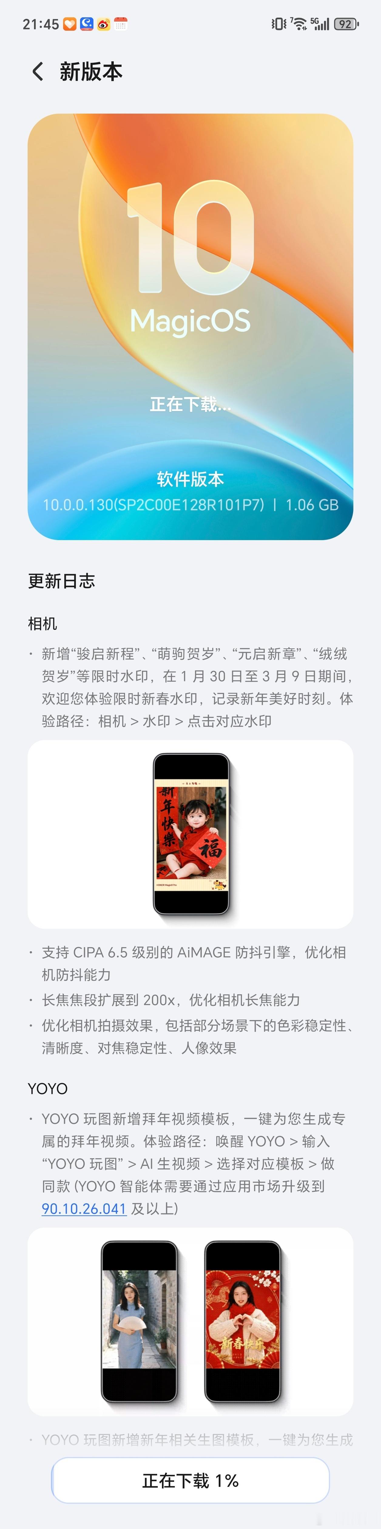 Magic8系列10.0.0.130版本更新推送,可以点击升级尝鲜抢先体验