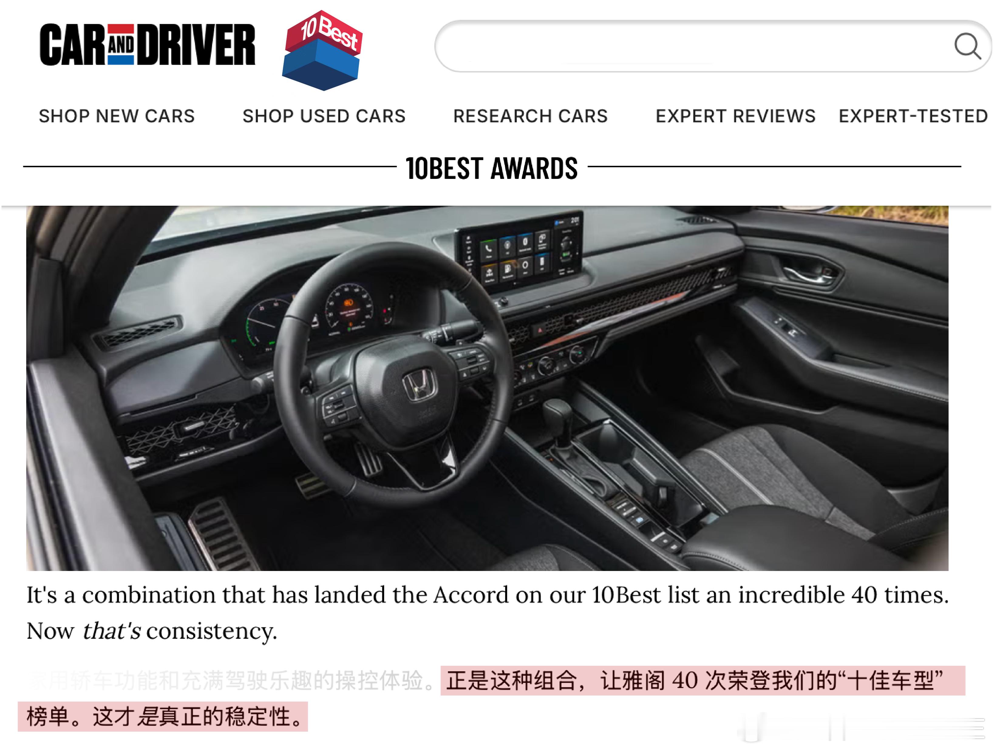 雅阁最近可真是出尽了风头。在北美,它又登上美版《Car and Driver》“10佳车”轿车榜单,都第40次拿这奖了,实力杠杠的。美国「U.S. News & World Report」也给力,给雅阁颁了2026年度「最佳性价比车型」,它都连续三年蝉联中型轿车冠军了。