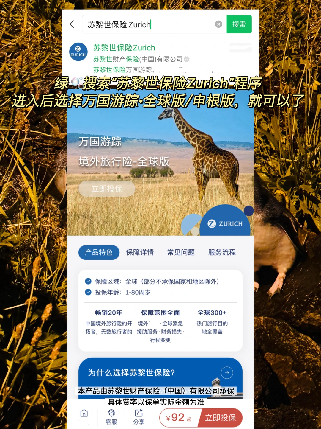 绿🫧搜索“苏黎世保险Zurich”程序,进入后选择万国游踪·全球版/申根版,就可以了