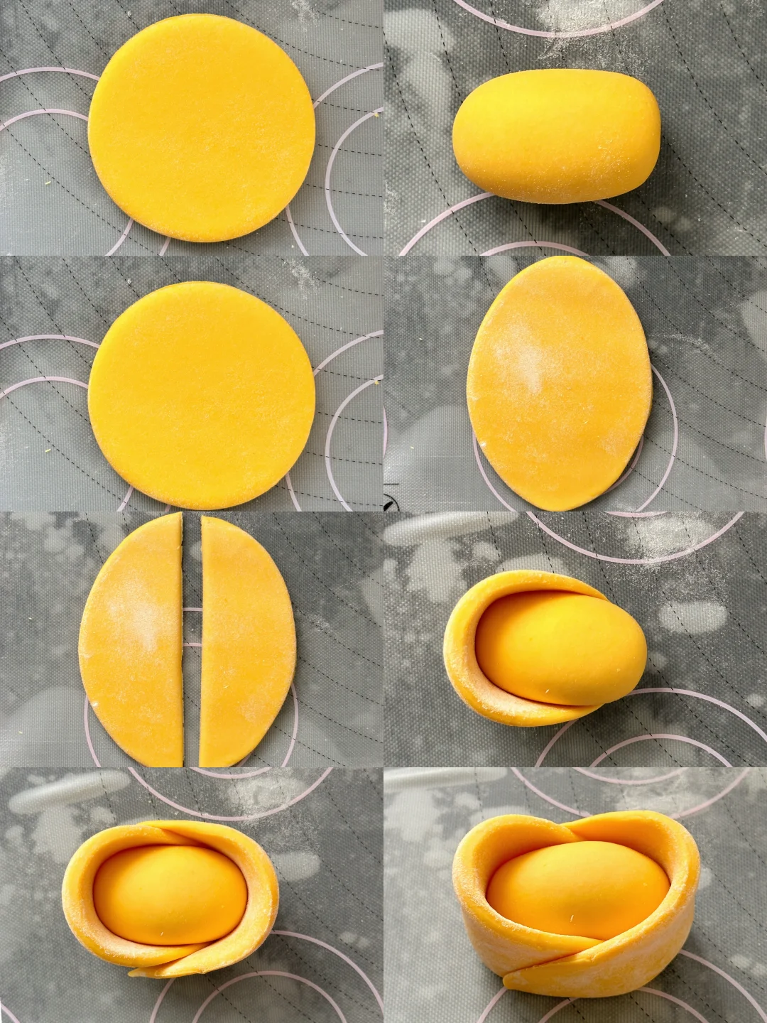 3️⃣一个圆形面片揉成圆形面团再稍微搓长条一点,再取一个面片将两头稍微擀薄,再从中间切成两片,分别贴在椭圆形面团两头(具体如图)。