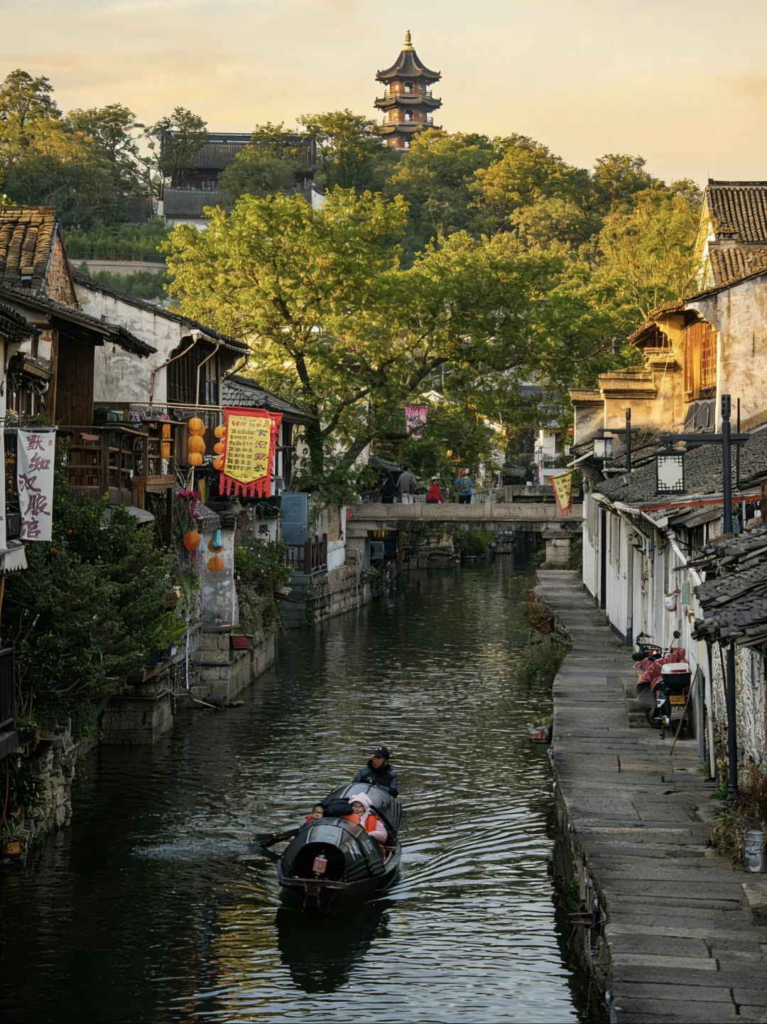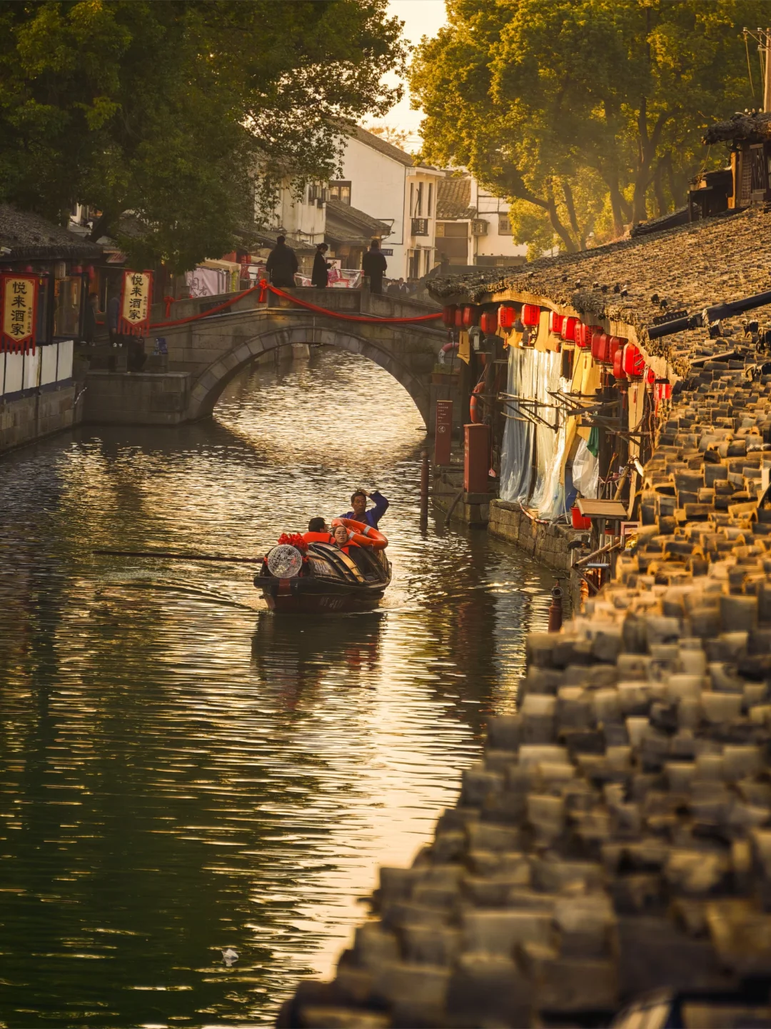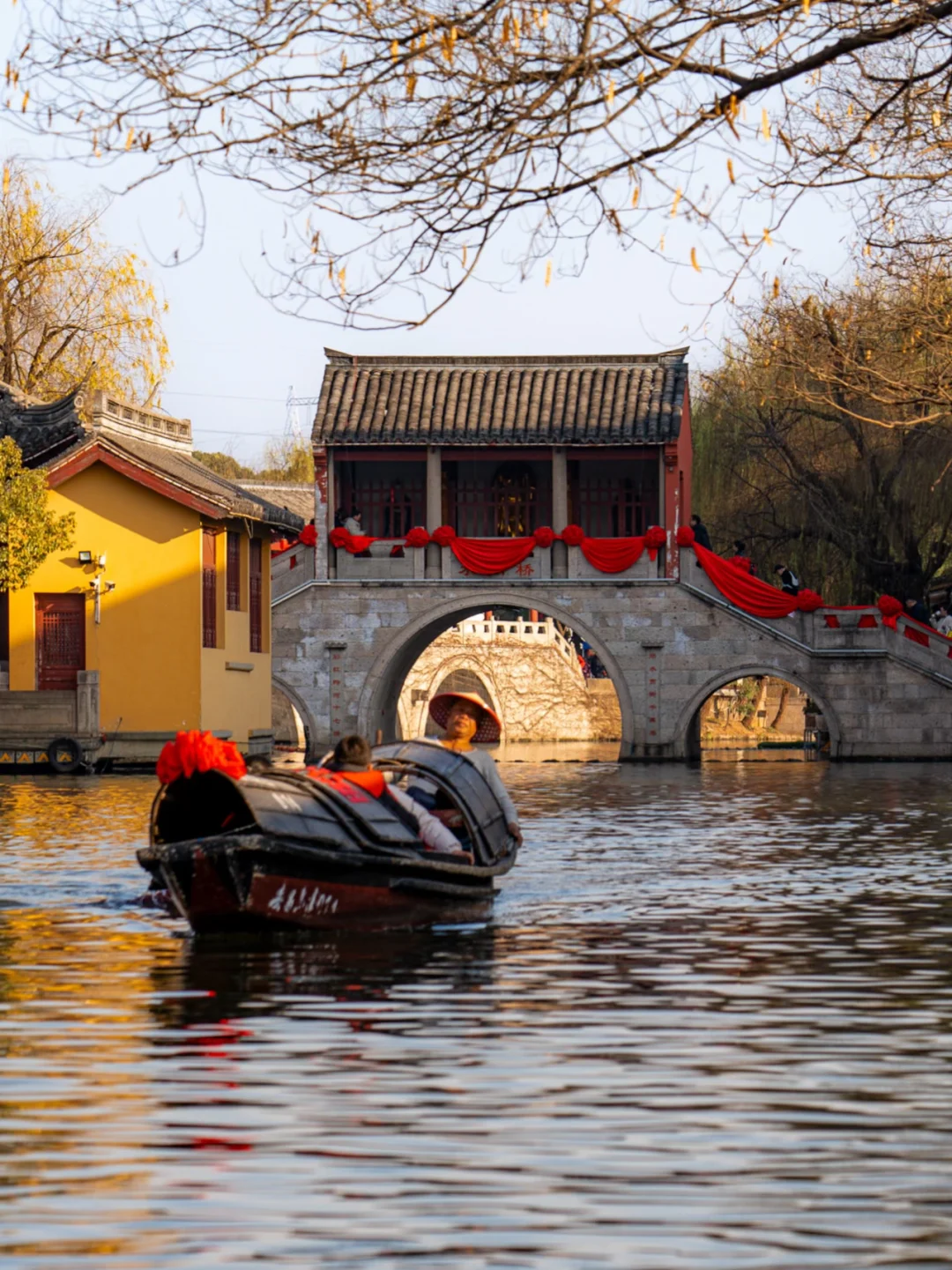 沿河长廊,灯笼高悬。乌篷船从桥下欸乃摇过,划开一池年节的热闹与静谧