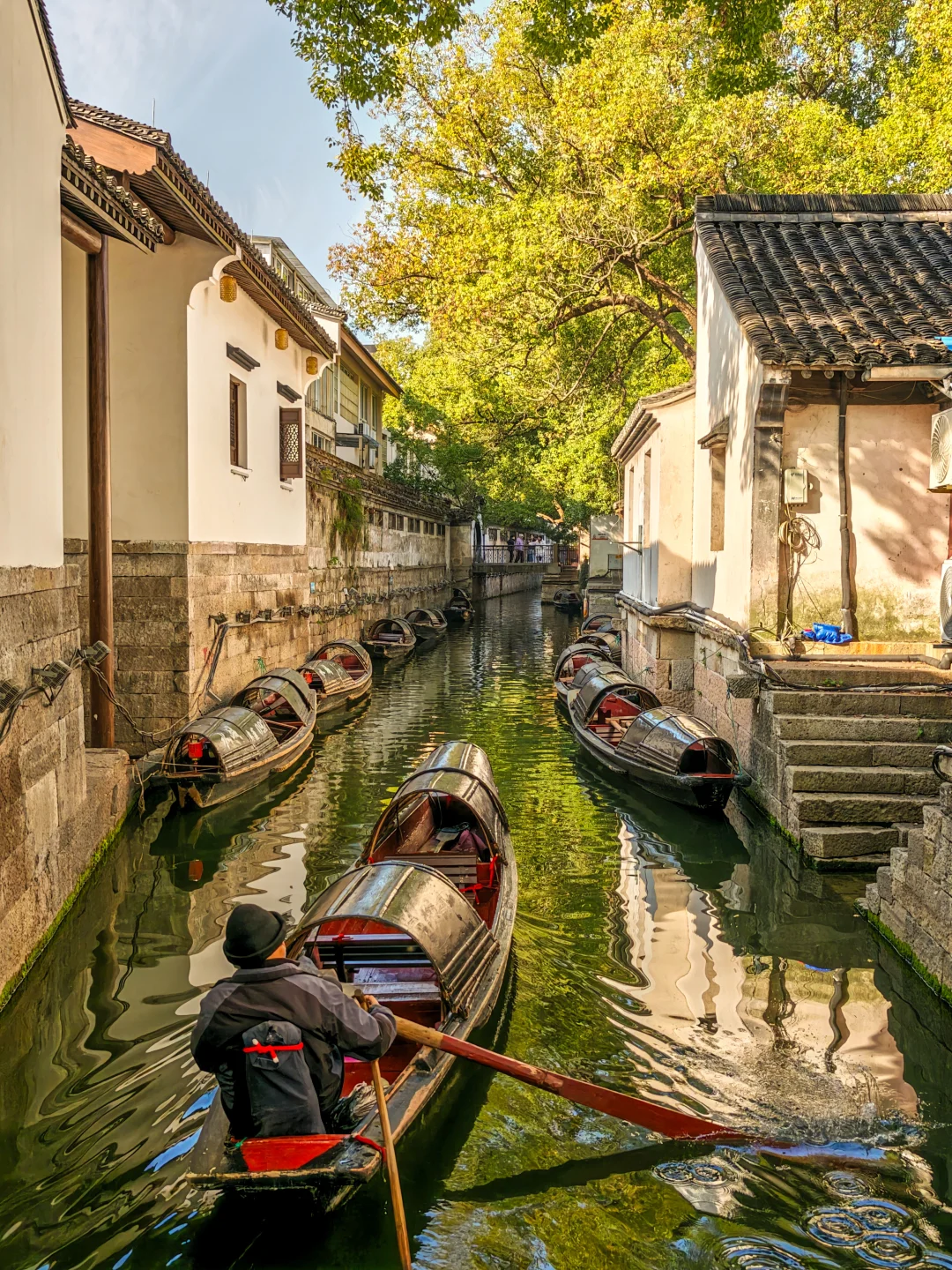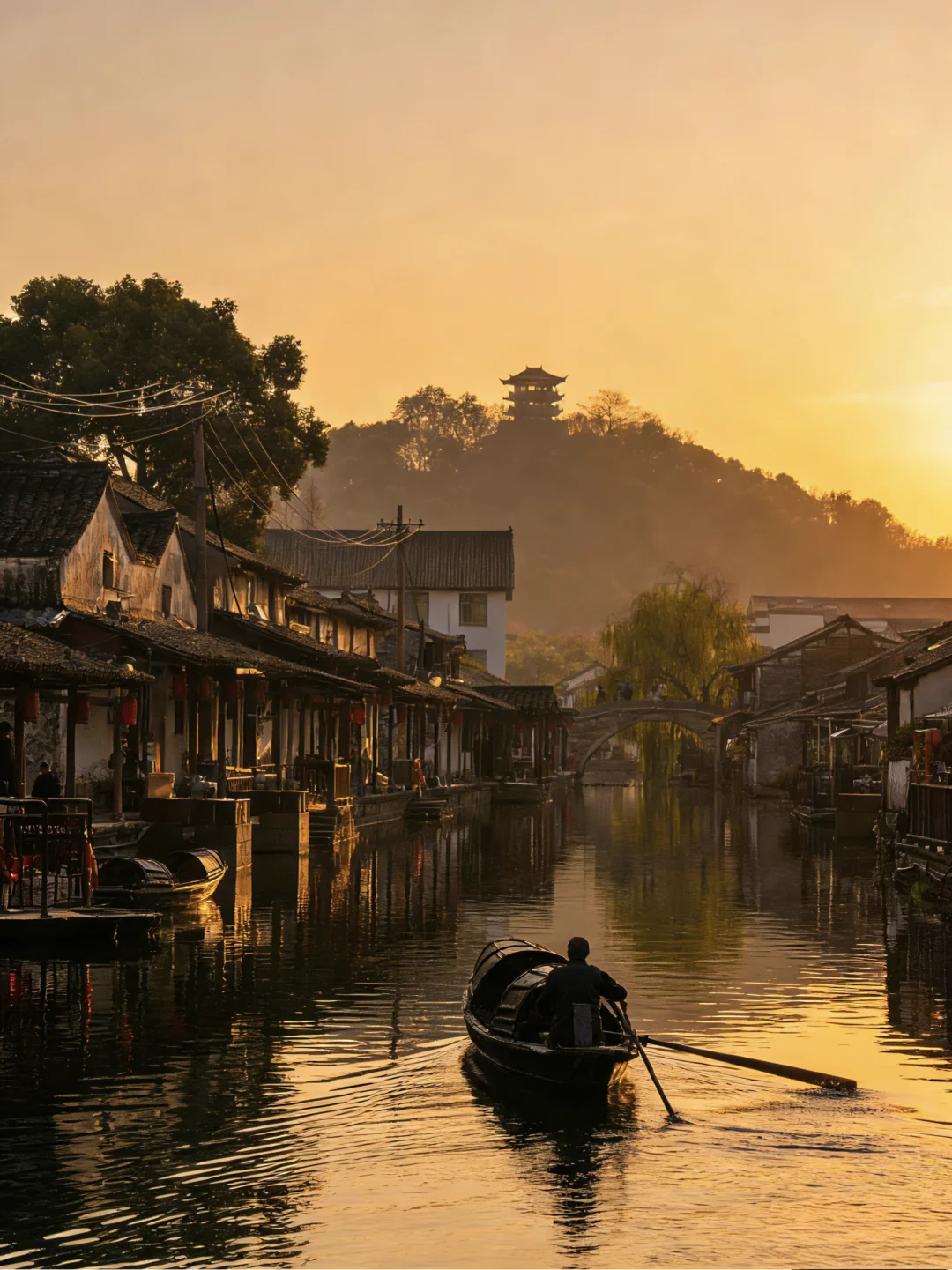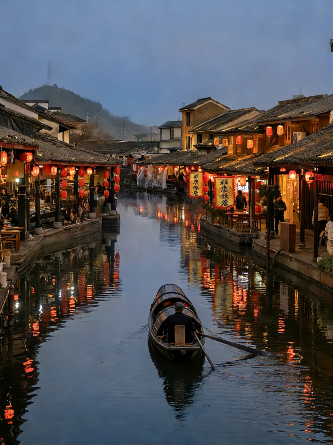 沿河长廊,灯笼高悬。乌篷船从桥下欸乃摇过,划开一池年节的热闹与静谧