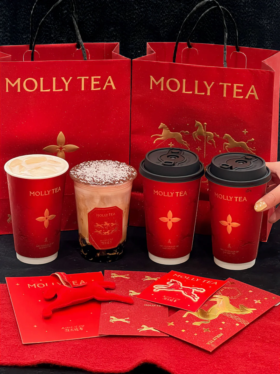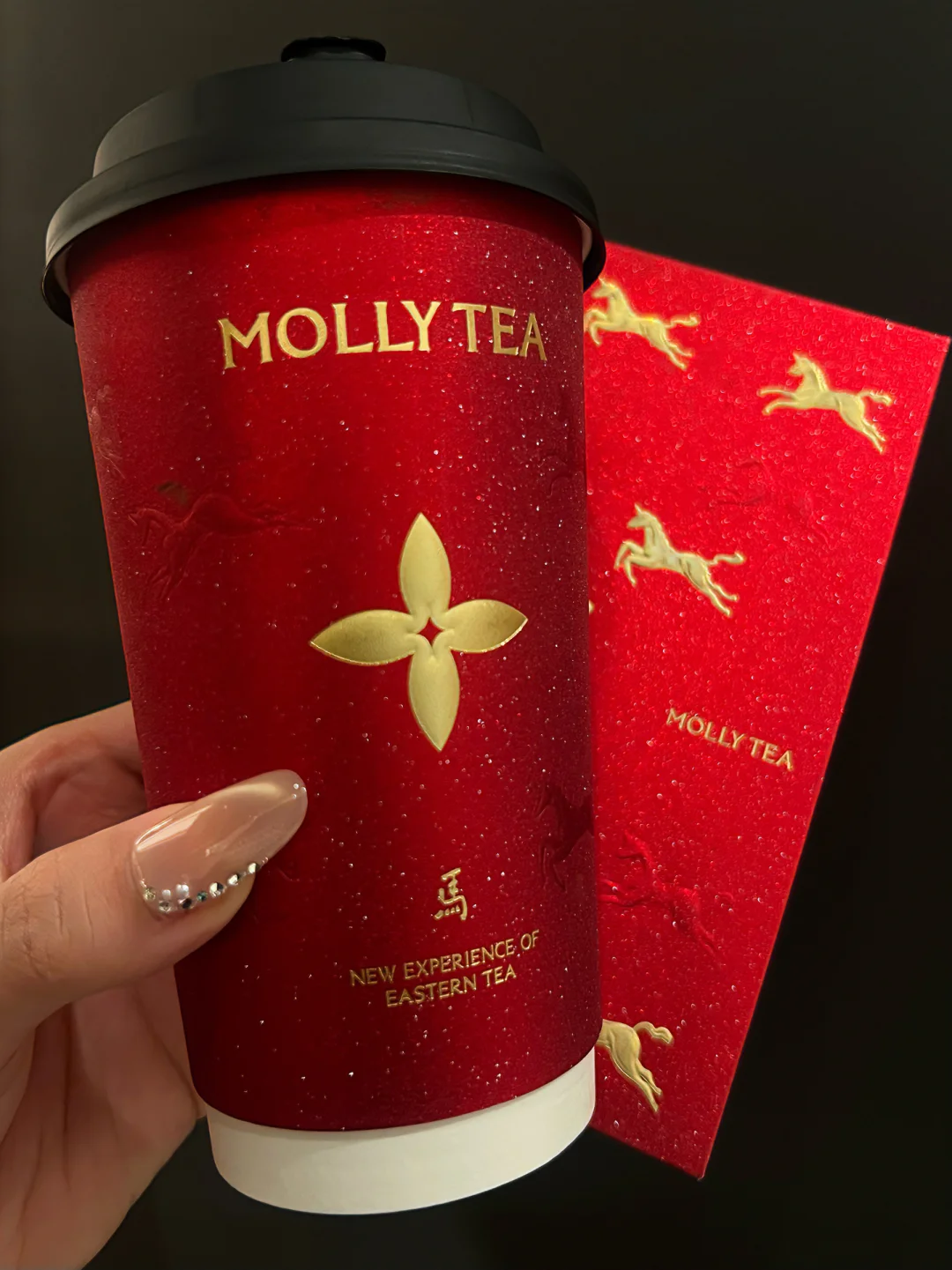 真!的!好!好!看!啊!! 茉莉奶白你小汁在新年初就卷出了新高度! 这bulingbuling闪闪发光的杯子真的闪晕我了,贵气逼人! 还有马年红包🧧、细绒高质感的马年香包和香氛贴都好精致!新年气氛满满!没有一秒犹豫的,统统拿下!! 香草慕斯金骏眉也好好喝!顶部可可粉和白巧碎,底部还有香草软酪和珍珠,奶香丝滑,真的香迷糊咯! 丝绒厚乳金骏眉要清爽些,金骏眉茶底和牛乳牛奶融合的很好
