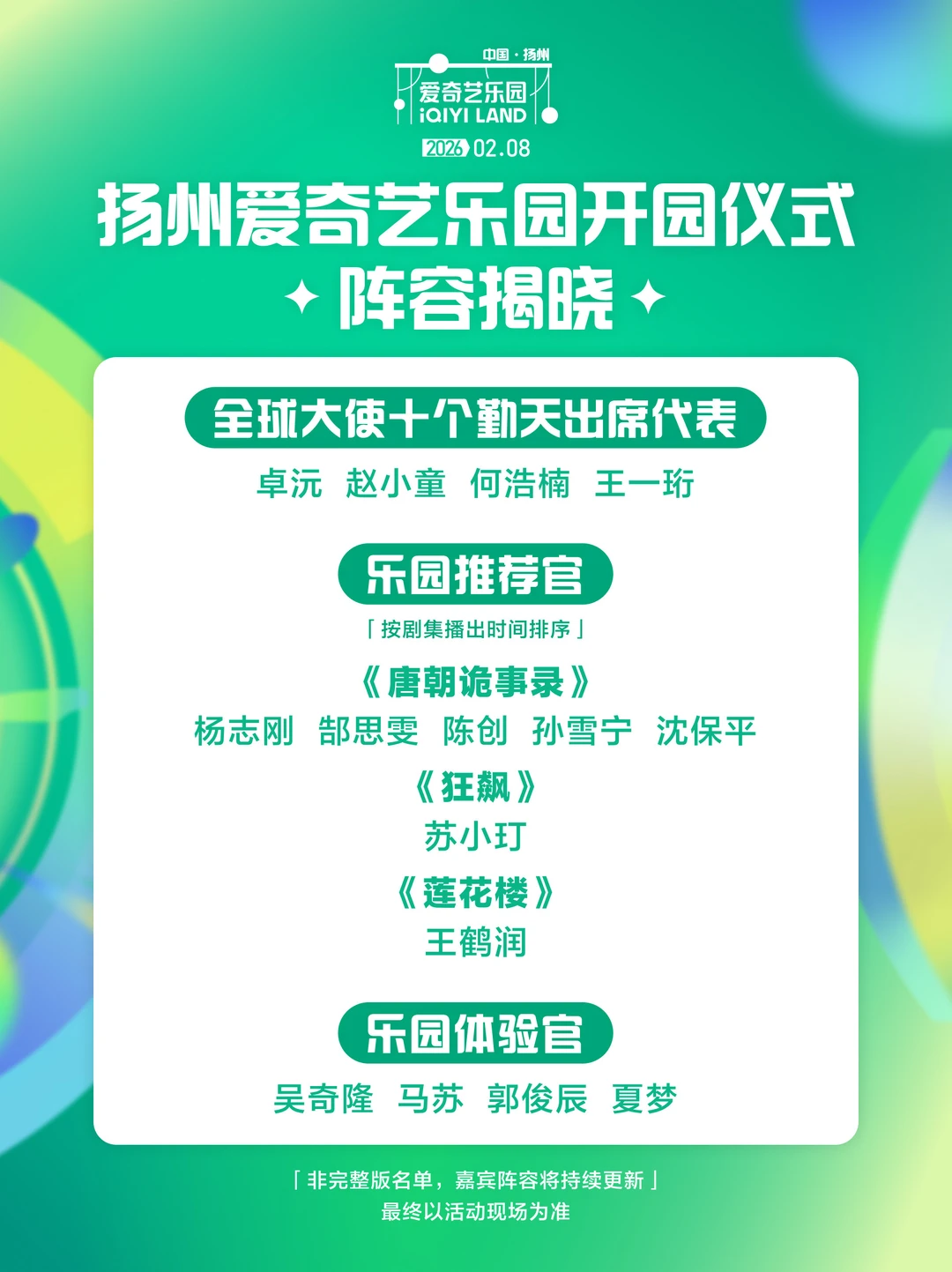 扬州爱奇艺乐园2月8日(这周日)正式开园 目前官宣开园仪式的明星嘉宾已经有15位😍 全球大使十个勤天出席代表:卓沅、赵小童、何浩楠、王一珩 乐园推荐官有几个核心IP: 《唐朝诡事录》杨志刚、郜思雯、陈创、孙雪宁、沈保平 《狂飙》苏小玎 《莲花楼》王鹤润 乐园体验官:吴奇隆、马苏、郭俊辰、夏梦(郭俊辰和夏梦的应该是因为《引灯诀》去的) 有你想见的明星吗? 期待2.8开园仪式!