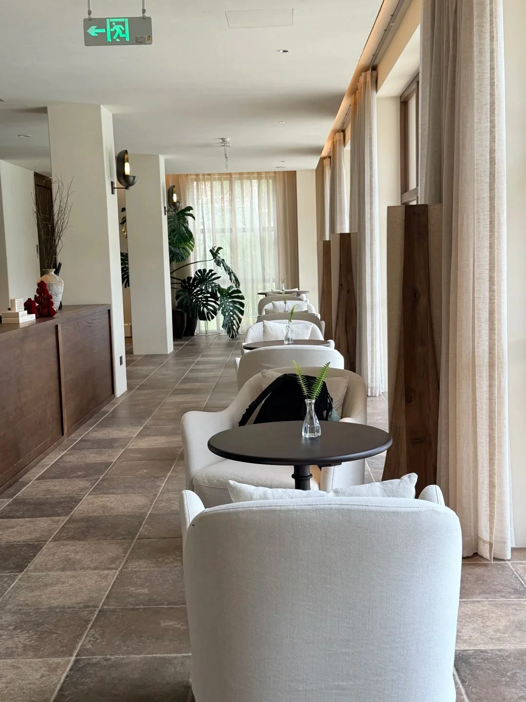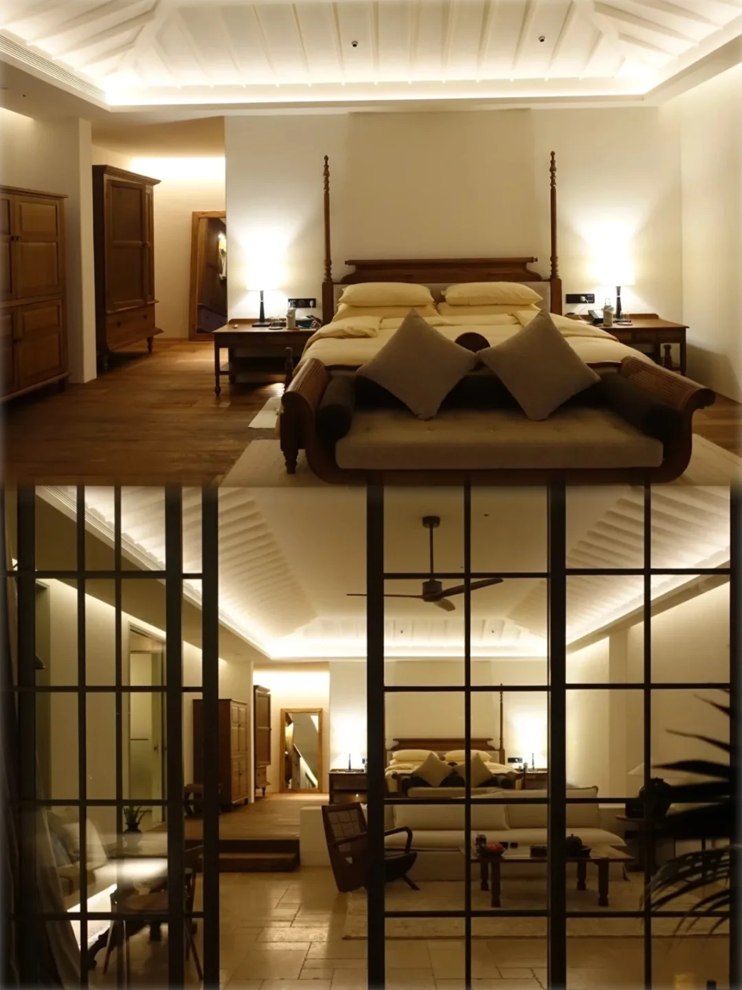 酒店本身即是主体景观。赭红色的墙体、利落的线条,与周围连绵的绿色峰林和田园,形成充满张力的视觉对比。它不寻求融入,而是以现代艺术姿态,与千年地貌进行一场安静对话。