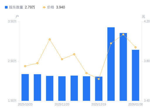 近一年(2025年2月10日至2026年1月30日),扬子新材A股股东户数从2.55万户,增加至2.79万户,增幅9.45%,区间股价上涨32.21%。