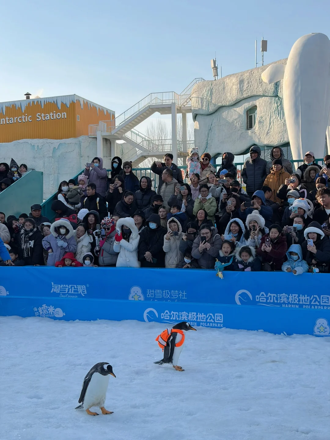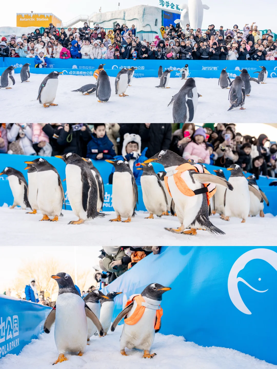 ✅冬季一定要看的就是淘学企鹅冰雪巡游啦,每天2场在极地广场,50只企鹅一起巡游的场面也就在哈尔滨能看到啦,背着橙色书包的是顶流大明星百亿流量Ip“淘淘”,结束后也可以近距离合影!