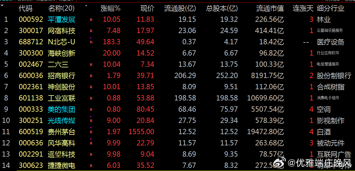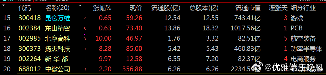 列表之二:分别是:涨跌版、现价、流通股、总股本、流通市值、连涨天数、细分行业等排列。