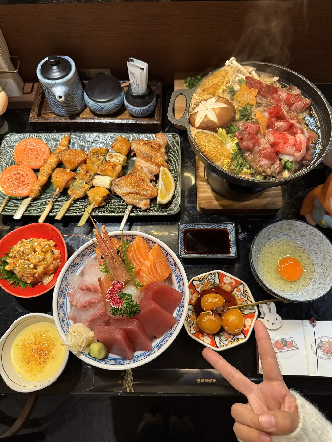 多拼海鲜丼!!我真的一生推!金枪鱼+三文鱼+甜虾……厚切大块 鲜甜软糯!配点甜姜和山葵酱真的鲜香不腻 太好吃了!! 烤鳗鱼外焦里嫩,咸甜入味我可以吃完一整碟!寿喜烧咕噜噜冒着热气,一碗下去整个人都暖了!还有各种烧鸟、炸物…都好好吃!会成为我来无数次的理由!