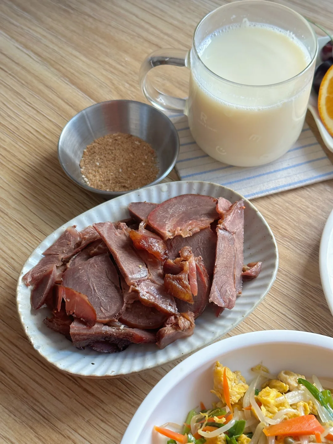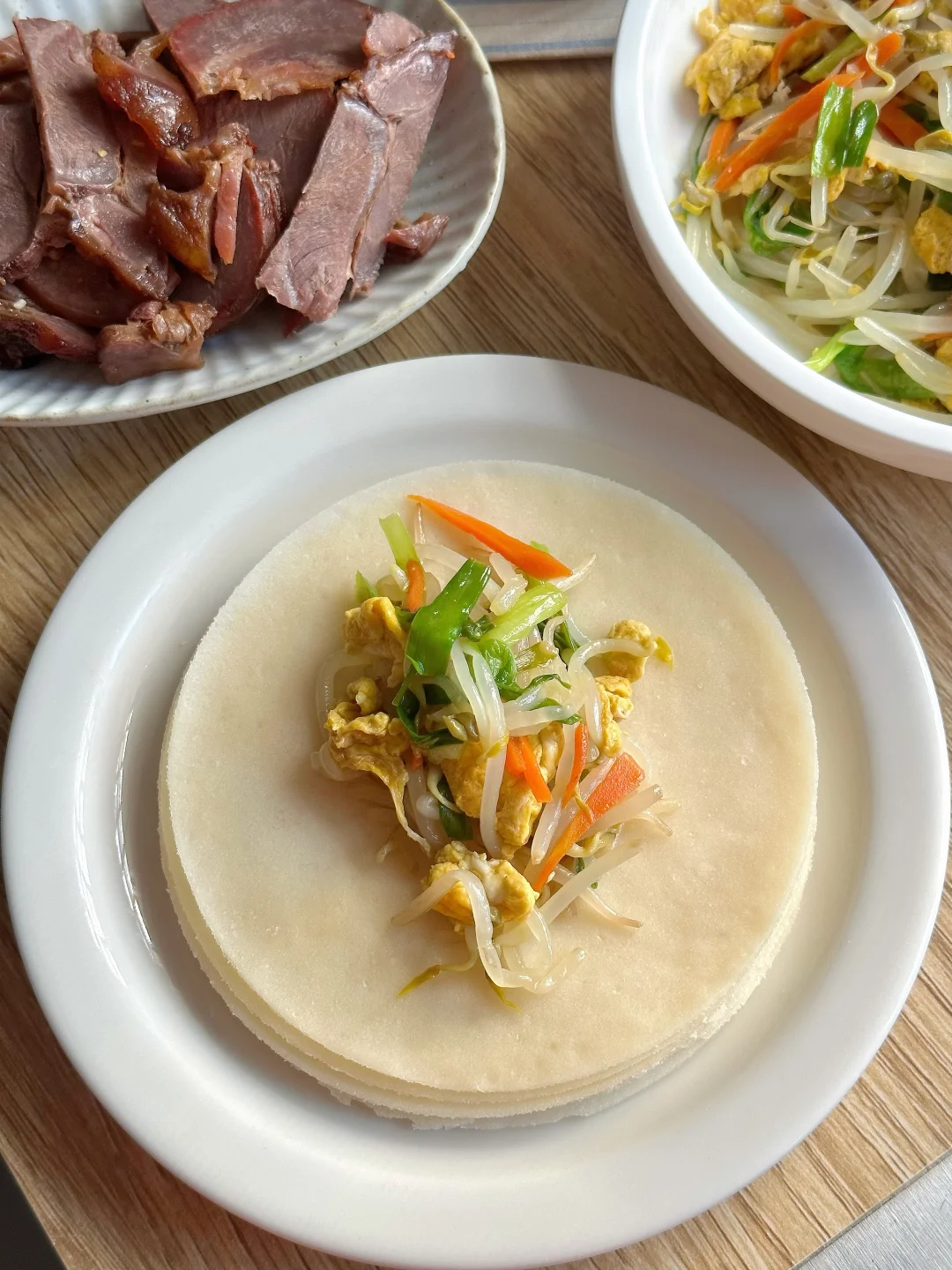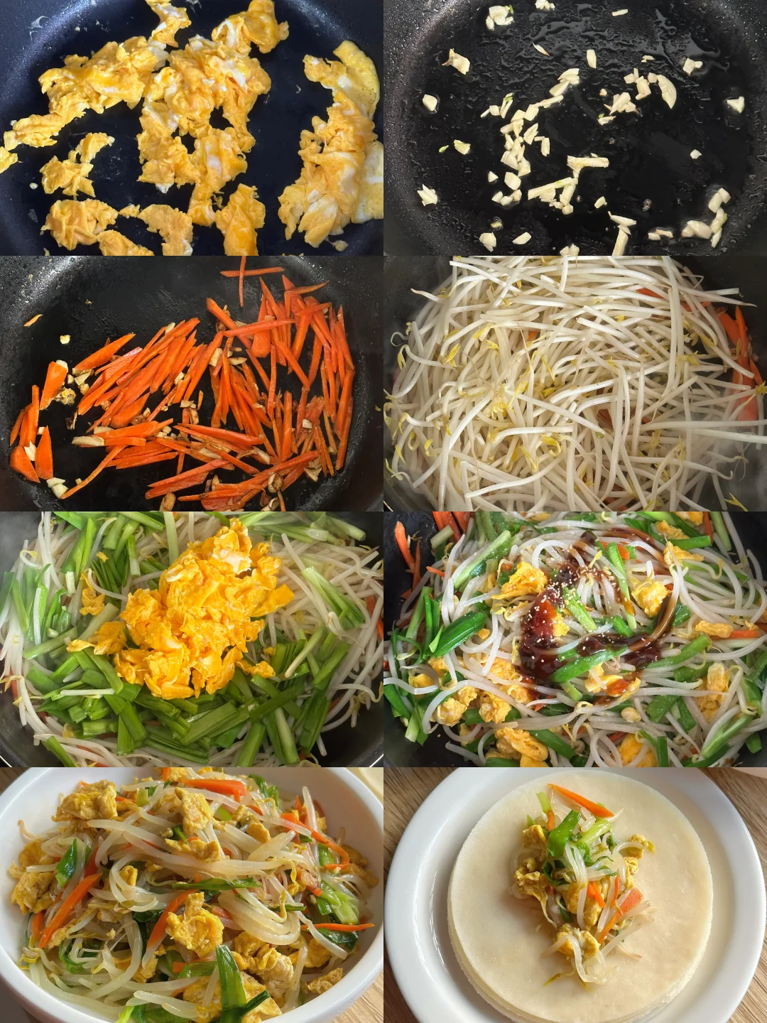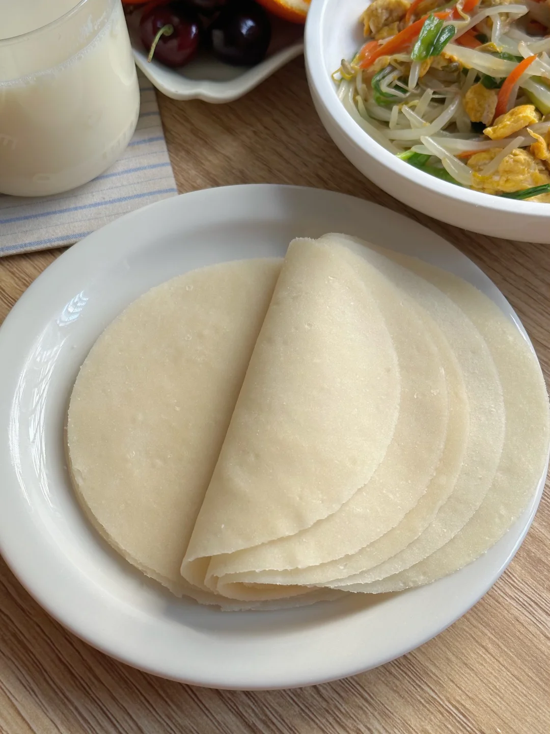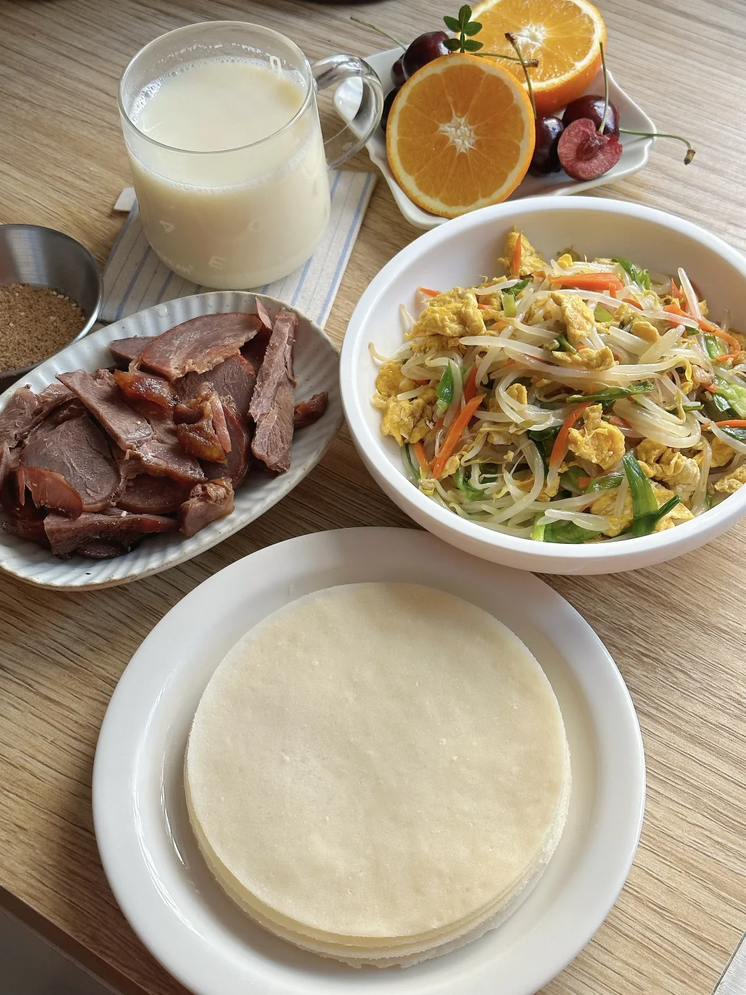 🌯春饼 🥩卤牛肉 🍊橙子 🥛豆浆 立春仪式感~春饼安排上😋 简单炒了合菜,韭菜豆芽胡萝卜配鸡蛋,卷进薄韧的春饼里,再夹几片卤牛肉,一口下去咸香鲜爽! 配杯温乎乎的豆浆,早餐吃得暖乎乎! 老话说春吃芽、咬春迎福,新的一年也愿事事顺遂,春风得意🌱