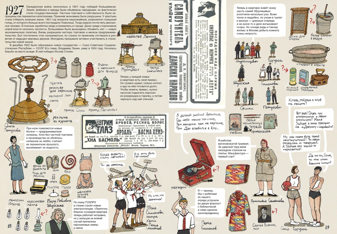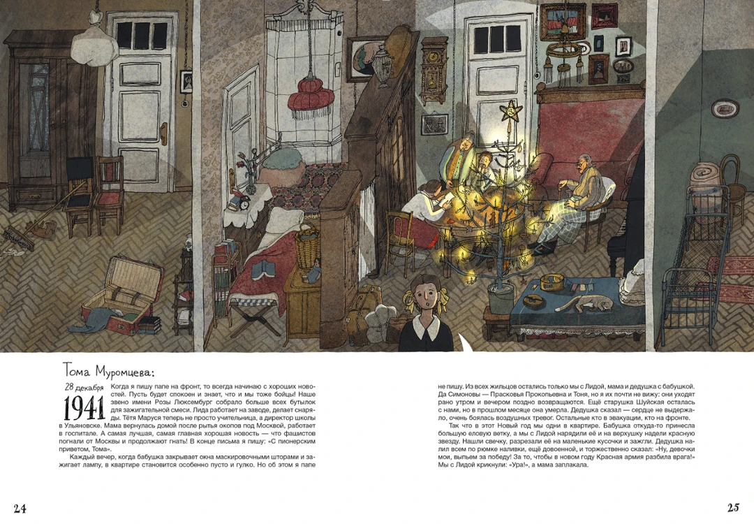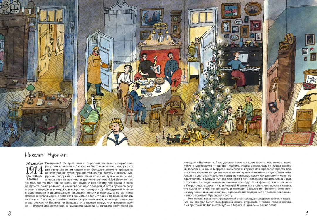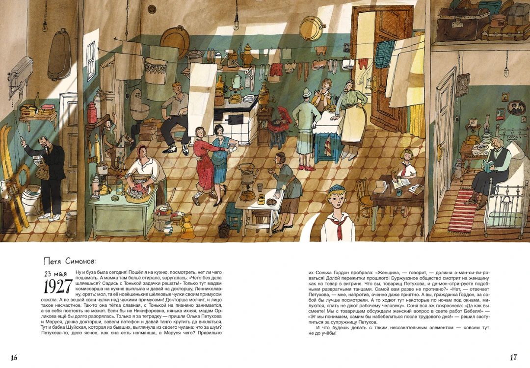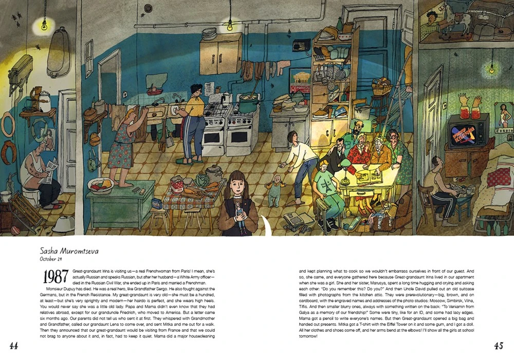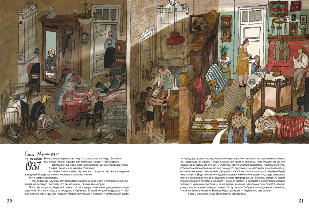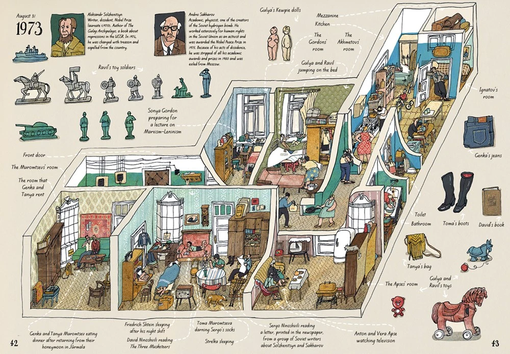 在大幅页面里,插画家安娜(Anna Desnitskaya)用朴素的卡通风格展示公寓的剖视图,细致入微地展示了这个家族在不同时代的生活图景。在这栋公寓里,穆罗姆采夫家族经历了婚礼、出生和葬礼,也跟随国家走过了社会主义集体化,二战后的强盛,冷战后的解体…...即便在这些特殊年代,我们窥见的仍是公寓里一家人的平凡生活。