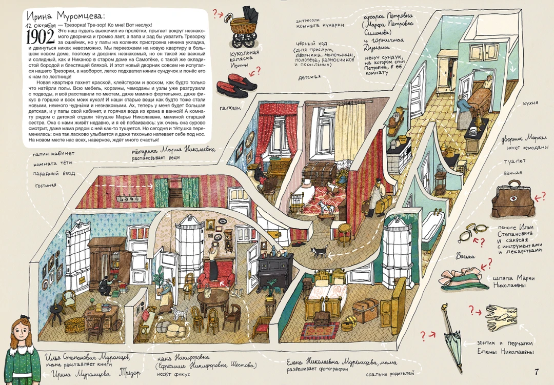 公寓的布置总是发生着变化:在不同的时代,他们吃什么,穿什么,玩什么,阅读什么,谈论什么,都对我们清晰可见。但不变的是一家人的紧密连接。他们在匮乏的年代相互支撑,在荣光的时期充满自豪。可以说,穆罗姆采夫家族在这栋公寓上演的“百年生活”,正是俄罗斯的百年兴衰。