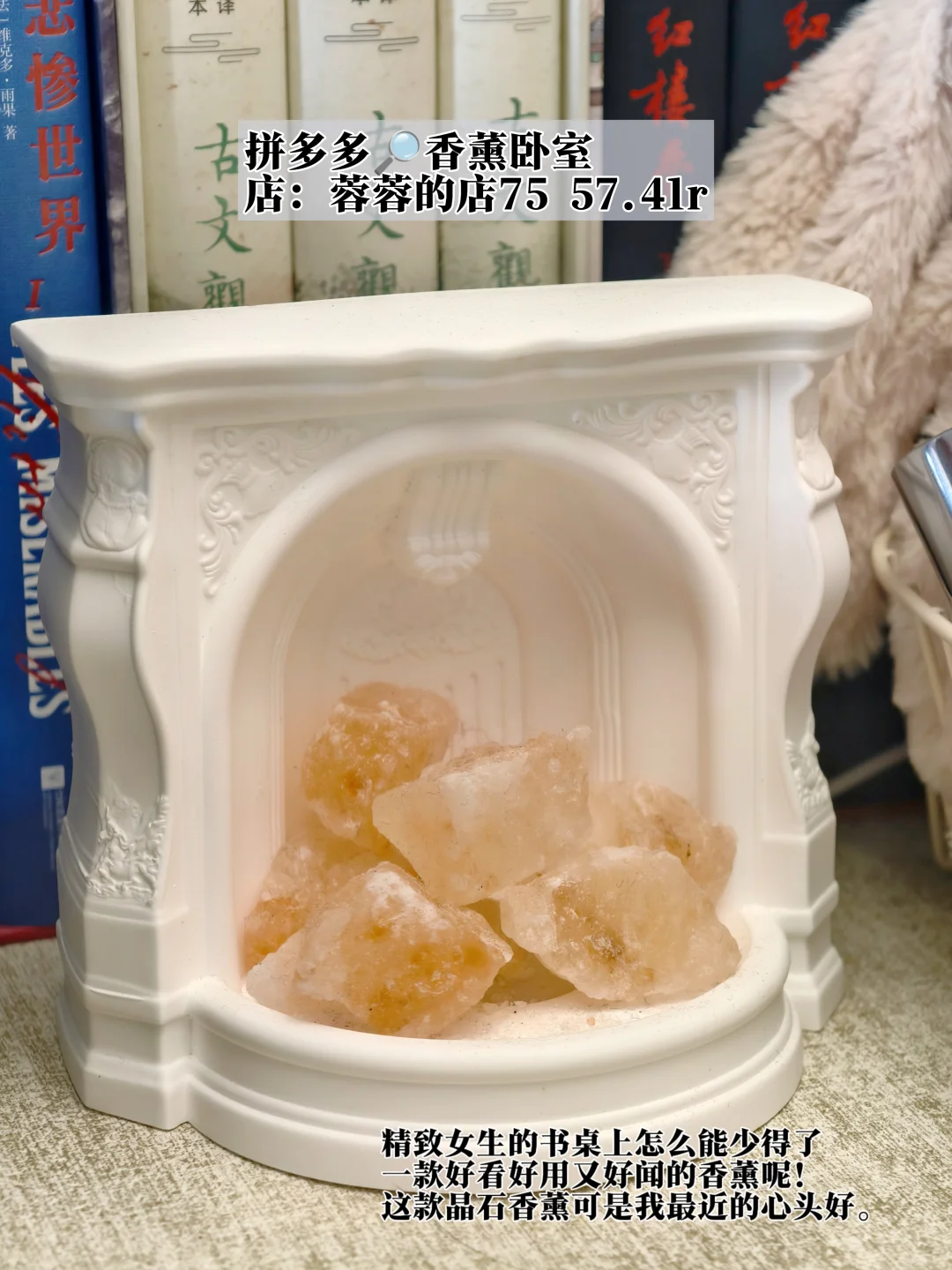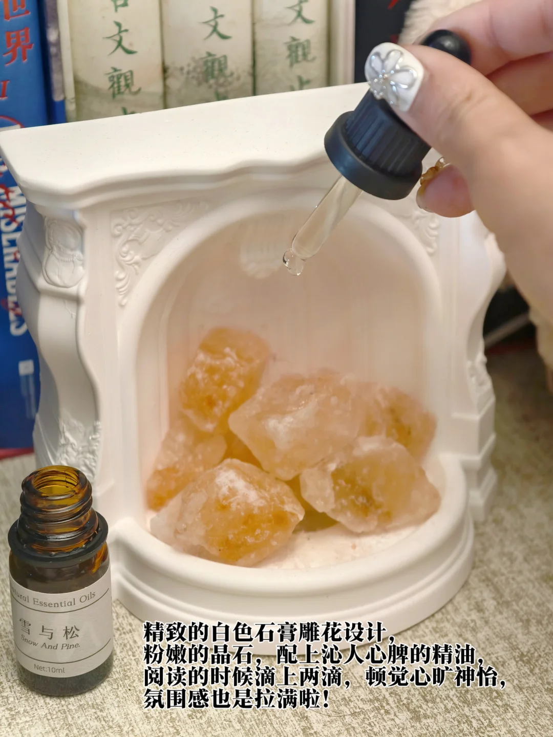 精致女生的书桌上怎么能少得了一款好看好用又好闻的香薰呢!这款晶石香薰是我最近的心头好,精致的白色石膏雕花设计,粉嫩的晶石,配上沁人心脾的精油,阅读的时候滴上两滴,顿觉心旷神怡,氛围感也是拉满啦!