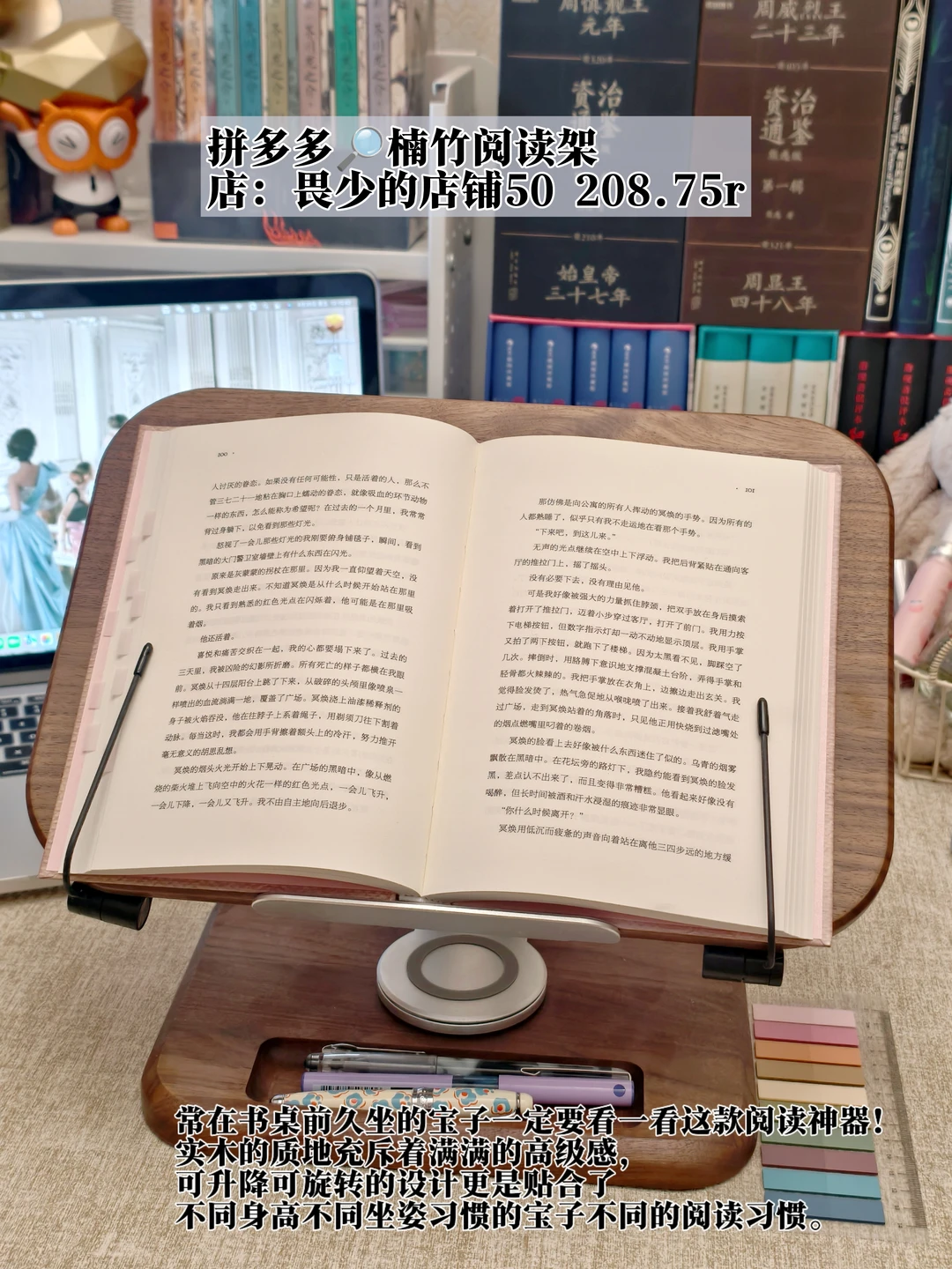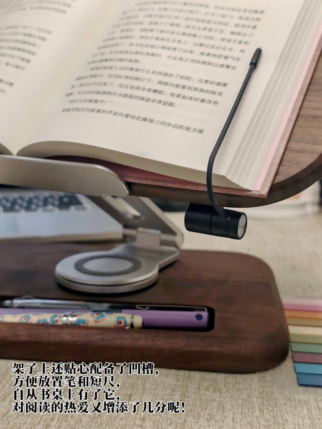 常在书桌前久坐的宝子一定要看一看这款阅读神器!实木的质地充斥着满满的高级感,可升降可旋转的设计更是贴合了不同身高不同坐姿习惯的宝子不同的阅读习惯,架子上还贴心配备了凹槽,方便放置笔和短尺,自从书桌上有了它,对阅读的热爱又增添了几分呢!