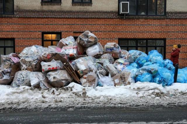 2月2日,纽约曼哈顿,大街上垃圾堆积如山。