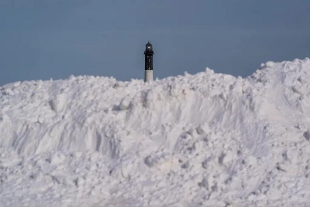 当地时间2026年2月1日,美国纽约州巴比伦,罗伯特·摩西州立公园,大雪堆后的火岛灯塔。