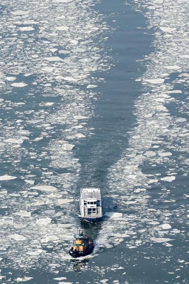 2月3日,美国纽约,船只在哈得孙河上的浮冰间航行。