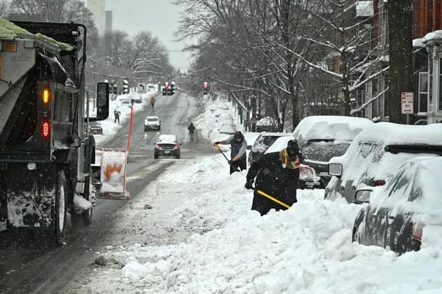 1月26日,美国纽约州奥尔巴尼,冬季风暴期间,一辆扫雪车在麦迪逊大道上行驶,人们正在清理被雪覆盖的汽车。