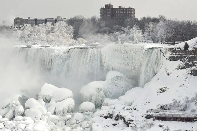 极端低温不仅给城市运行带来挑战,也造就了罕见的自然奇观。长岛大南湾往日碧波荡漾的水域被厚重冰层覆盖,景致宛如北欧冬日。尼亚加拉大瀑布则被严寒“定格”,往日奔腾不息的瀑流凝结成冰,银装素裹间尽显磅礴与静谧交织的美感。