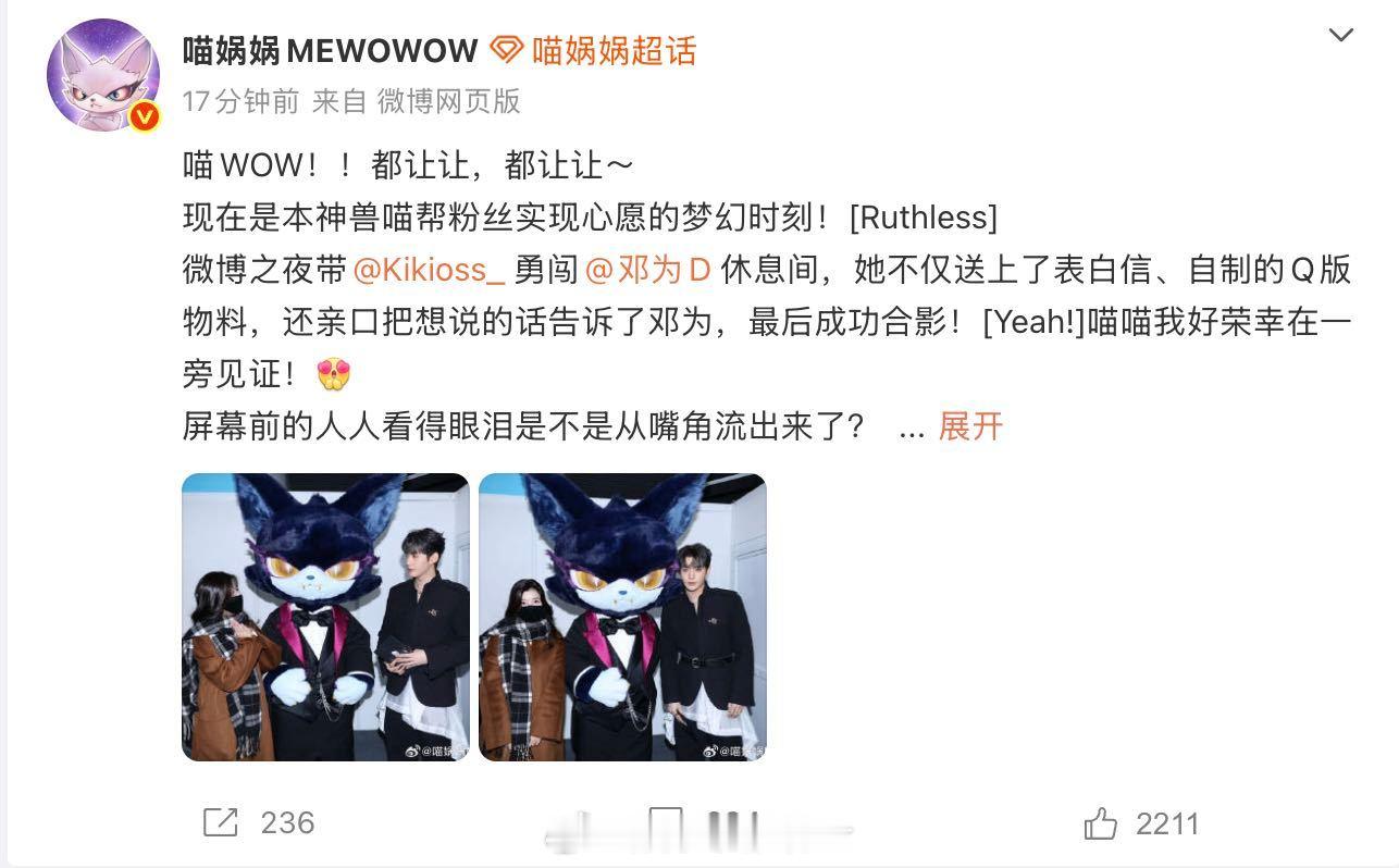 喵娲娲帮粉丝追星邓为 又解锁新成就!微博之夜帮粉丝圆梦邓为,表白信、Q版物料、面对面表白、同框合影一条龙服务,这波操作直接把宠粉打在公屏上!