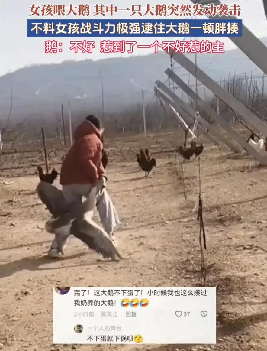 🌙山东,一大学生放假回家,帮家里喂大鹅时,一只大鹅突然对女生发动袭击,没成想,女生不但没害怕,反而战斗力极强,直接把大鹅给打老实了,妈妈询问要不要把大鹅做掉,女生表示等把它打服再说。 这位女大学生姓李,是山东济宁一所高校的大二学生,家在乡下,爸妈平时除了种地,还养了一群大鹅,一共十几只,大多是用来下鹅蛋,偶尔也会留几只过年宰杀,这群大鹅在村里小有名气,因为性子格外凶猛,平时连村里的小狗都不敢轻易招惹它们。 小李小时候也经常跟着爸妈喂鹅,只是后来上了高中、大学,回家的次数越来越少,喂鹅的活儿也渐渐生疏了。 这次放假回家,爸妈白天忙着下地干活,没时间打理大鹅,小李看着爸妈辛苦,就主动揽下了喂鹅的任务,想着帮家里分担一点,也重温一下小时候的乐趣,却没料到,这一揽,竟揽来了一场“意外冲突”。 事发当天下午,小李按照妈妈的嘱咐,拎着提前拌好的玉米碎和青菜,来到院子里的鹅圈旁。往常这个时候,大鹅们都会主动凑过来,嘎嘎叫着要吃食,可那天,小李刚走到鹅圈门口,就发现一只体型最大的大白鹅,独自站在鹅圈中央,脖子挺得笔直,脑袋微微低下,双翅微微张开,一副戒备十足的模样,和其他温顺的大鹅截然不同。 小李一开始没太在意,只当这只大鹅是饿极了,着急吃食,便弯腰打开鹅圈的小门,准备把食物倒进去。可就在她弯腰的瞬间,那只大白鹅突然猛地冲了过来,嘎嘎叫着,伸长脖子就往她的小腿上啄,速度快得让她来不及反应。 周围路过的邻居,看到这一幕都下意识地喊“快躲开,这只鹅最凶了,咬到人可疼了”,可让人意外的是,小李非但没有害怕,也没有逃跑,反而被这突如其来的袭击激起了斗志,眼神一下子变得坚定起来。 她迅速直起身,往后退了一步,避开了大鹅的第二次袭击,顺手从旁边捡起一根细细的树枝,这根树枝是妈妈平时用来赶鹅的,不粗不细,刚好能用来防备。 那只大白鹅见小李没有逃跑,反而拿起了树枝,变得更加凶猛,再次伸长脖子冲了过来,一边啄一边扇动翅膀,把地上的尘土都扇了起来。 小李眼神紧紧盯着大鹅的动作,趁着大鹅冲过来的瞬间,轻轻侧身躲开,同时用树枝轻轻拍打大鹅的脖子。大白鹅被拍了一下,愣了一下,随即更加疯狂地袭击,可不管它怎么冲、怎么啄,都被小李灵活地躲开,还时不时被树枝拍打几下,渐渐没了一开始的气势。 就这样对峙了几分钟,大白鹅的动作越来越慢,翅膀扇动的力度也小了很多,脖子也渐渐垂了下来,嘎嘎叫的声音也变得微弱,不再主动发动袭击,只是站在原地,警惕地盯着小李,偶尔动一下脑袋,显然是被小李打老实了。 这一幕刚好被从地里回来的妈妈看到,妈妈赶紧跑过来,拉着小李的手,查看她的小腿,担心她被大鹅咬伤,一边查看一边着急地问“有没有受伤?疼不疼?这只鹅太凶了,实在不行,咱们把它做掉,省得以后再咬人”。 小李看着妈妈着急的样子,笑了笑,摇了摇头说“妈,我没事,就是被啄了一下,不疼,不用做掉它,等我把它打服再说”。 妈妈看着小李坚定的样子,无奈地笑了,只好点了点头,吐槽道“你这孩子,跟小时候一样,越挫越勇,这只鹅在咱们家称王称霸这么久,也该有人治治它了”。 小李的弟弟刚好放学回家,看到院子里的场景,赶紧拿出手机,把小李和大鹅对峙的片段拍了下来,发到了网上,原本只是觉得有趣,想记录一下日常,没料到,这段短视频很快就走红了,引发了网友们的广泛热议。 不少网友留言调侃“这届大学生战斗力太强了,连家禽界一哥都能治住”,也有网友分享自己被大鹅袭击的经历,诉说被大鹅支配的恐惧。 据悉,后来的几天,小李每天都会按时去喂鹅,每次喂鹅的时候,都会特意“教训”一下那只大白鹅,慢慢的,大白鹅彻底被小李打服了,再也不敢主动袭击她,甚至看到小李过来,都会主动往后退,乖乖地站在一旁,等着吃食,和之前霸道的模样判若两鹅。 一场普通的喂鹅,一场意外的袭击,一次果断的反击,让我们看到了女大学生不娇弱、有韧劲的一面。那只被打老实的大鹅,也成了乡村日常里的一个小插曲。 那么你觉得小李的做法有趣吗?如果是你,遇到凶猛的大鹅发动袭击,会选择躲避还是反击?欢迎在评论区留下你的观点。