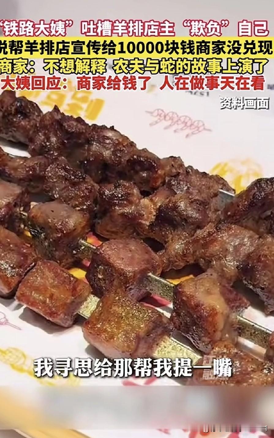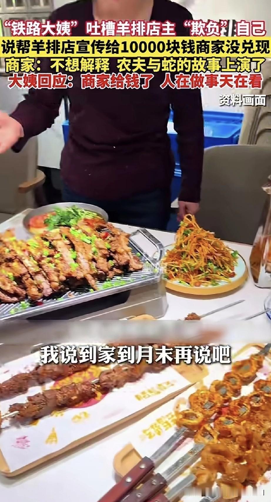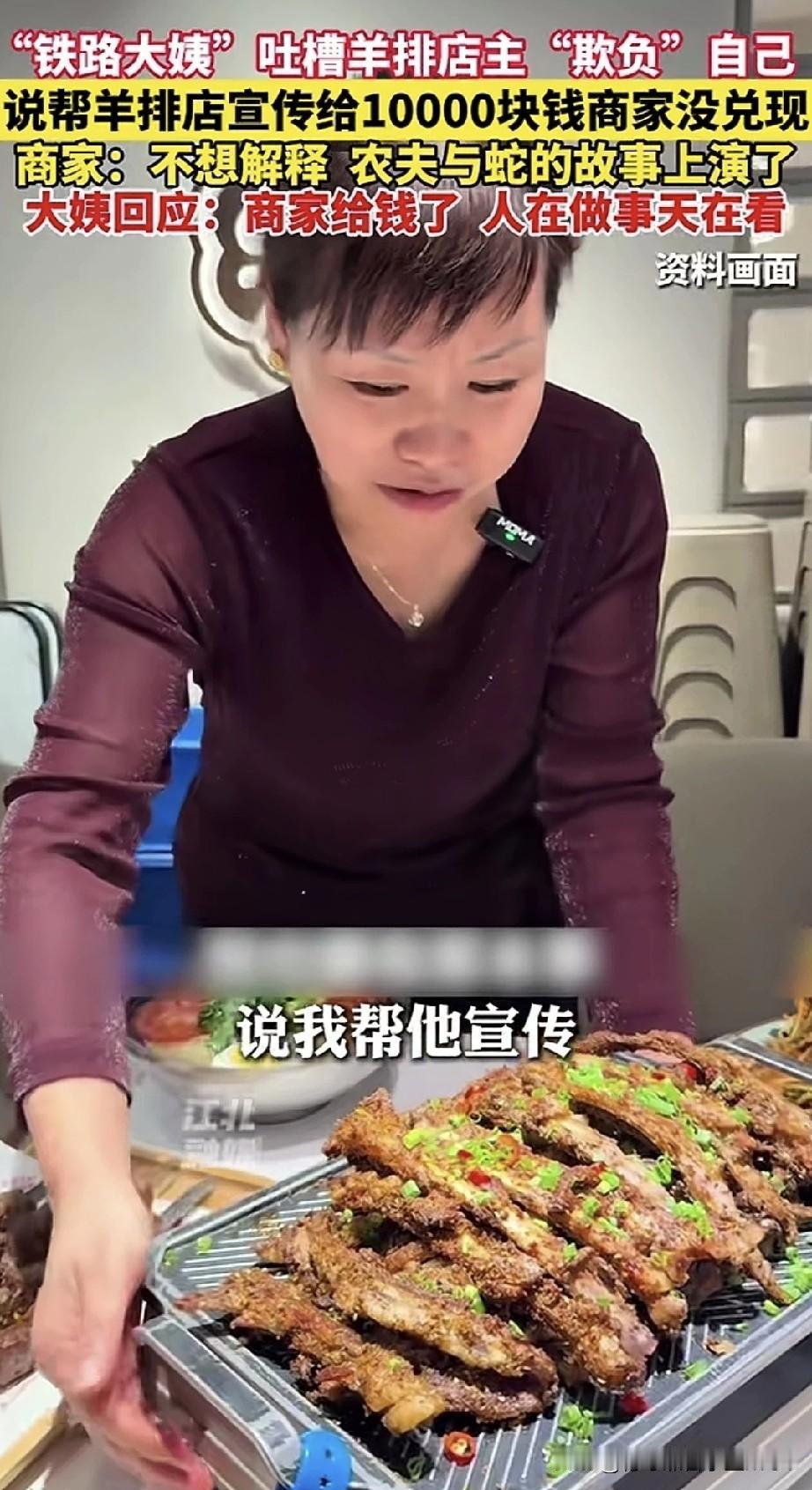 铁路大姨发视频,吐槽羊排店主欺负自己,说好帮他宣传他家羊排店,给10000元,羊排店主没有兑现。刚看了有人专门了解详细情况,他的说法是:大姨刚被铁路辞退在家无业,羊排老板联系她让去羊排店上班,是上班,每月工资是一万。大姨家是佳木斯,羊排店在哈尔滨,大姨去了,但是觉得各种不方便,待遇也和心理价位有差距。不想在羊排店,羊排店老板就把大姨介绍给一个专门做直播的尹总,大姨就去了和这个尹总直播卖货去了。 争议是,大姨现在认为是羊排店是请她去拍广告一万一条,但是哈市一般网红为店家拍广告一条市场价顶格是五千。 羊排老板说法是请大姨去上班,因为大姨有网红名头,所以工资是每月一万。大姨曝光了以后,羊排老板就给大姨转了一万。猜测一下,开始以为这个大姨的热度会很高,会持续一段时间,于是就请过去了,后来发现热度没达到预期,就不想给钱了。