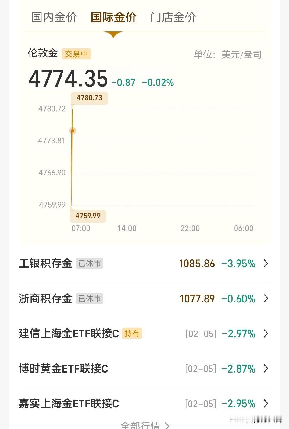 黄金跌回4700了, 而且还在继续下跌。 挂在树上的朋友,回本路渺茫而漫长,等吧!可能是十年。 当然也可能是十天,这东西没有一个人摸得透,包括那些预测机构,什么摩根大通,瑞银,都预测的高位震动直逼6000多美元,没有一个预测到大跳水至4700的。 所以就别指望自己的聪明才智能号到黄金的脉,你永远不知道下一刻是涨是跌,买黄金完全靠运气。 还是那句话,闲钱玩一玩可以,千万别指望投资黄金赚大钱。