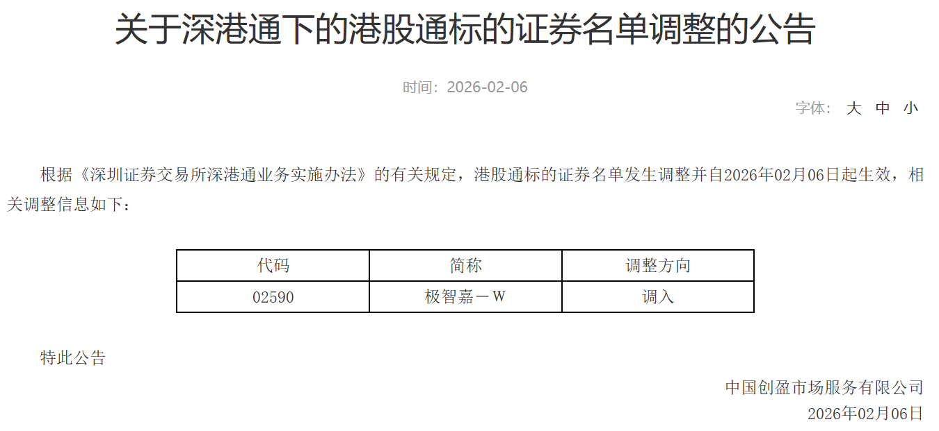 2月6日,深圳证券交易所发布《关于深港通下的港股通标的证券名单调整的公告》。根据《深圳证券交易所深港通业务实施办法》的有关规定,将极智嘉-W(02590)调入港股通标的证券名单,相关调整自2026年02月06日起生效。