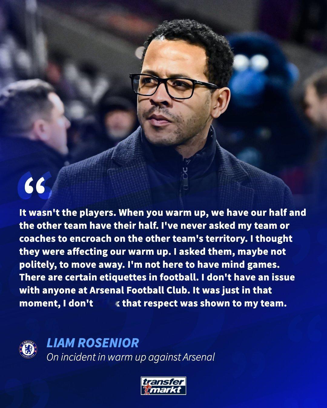 【蓝军主帅抨击枪手无礼】罗塞尼尔表示,在本周他的球队被阿森纳淘汰出英联杯后,他对阿森纳的部分工作人员感到不满👇: “问题不在于阿森纳的球员。我一直很尊重对手,热身时双方各有各的半场,我从没要求过我的球队或教练组去侵占对手的区域。” “当时我觉得他们的站位并不妥当,已经影响到了我的球员和教练组的热身。我(可能语气不太礼貌地)要求他们待在自己的半场。” “我不是来搞心理战的,我只是在做我认为正确且尊重对手的事,也希望大家都能遵守这一点。足球圈有一些不成文的礼仪,我一直努力做到尊重他人,也始终渴望赢球,但我绝不会让我的教练组做出那样的事。” “我对阿森纳的任何人都没有意见,他们有一位出色的主帅,米克尔是我非常敬重的人。只是在那一刻,我觉得我的球队没有得到应有的尊重。”切尔西