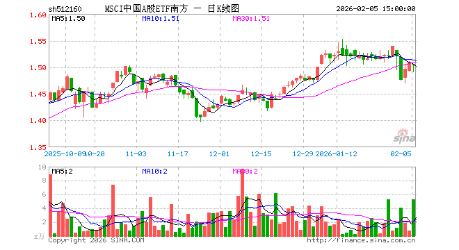 2月5日,MSCI中国A股ETF南方(512160)跌0.33%,成交额798.72万元。当日份额增加200.00万份,最新份额为1.42亿份,近20个交易日份额减少200.00万份。最新资产净值计算值为2.13亿元。