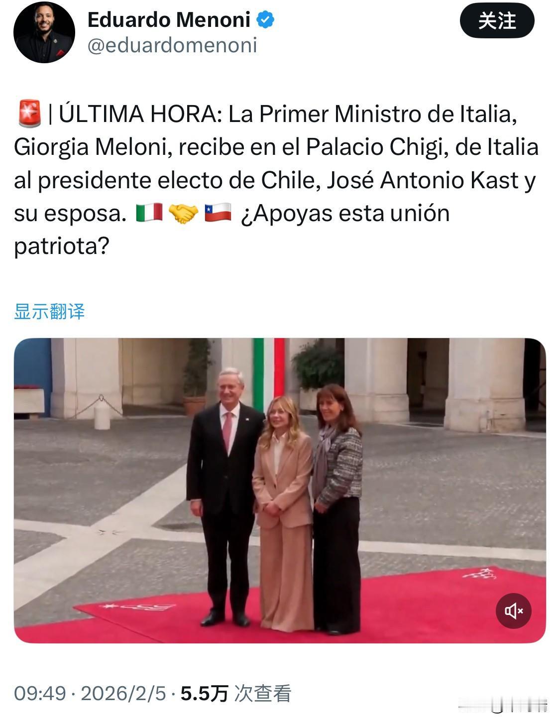 当地时间 2026年2月5日,意大利总理乔治娅·梅洛尼 (Giorgia Meloni) 在罗马基吉宫 (Palazzo Chigi) 会见了智利当选总统何塞·安东尼奥·卡斯特 (José Antonio Kast)。 此次会见是卡斯特就职前国际访问行程的一部分。会议主要涵盖了以下重点内容: 梅洛尼再次祝贺卡斯特在近期(2025年12月)的智利大选中获胜,并对两国关系的进一步加强表示期待。 卡斯特向梅洛尼介绍了未来智利政府的施政纲领,特别是在推动经济增长、吸引外国投资、打击犯罪以及支持生育政策等方面的优先事项。 双方在公共安全、打击非法移民、支持家庭及传统价值观等领域拥有相似的政策主张,并在会谈中探讨了相关经验的借鉴。 此前,卡斯特还访问了萨尔瓦多考察安保政策,并前往匈牙利布达佩斯会见了欧尔班总理。他预计将于 2026年3月 正式就任智利总统。
