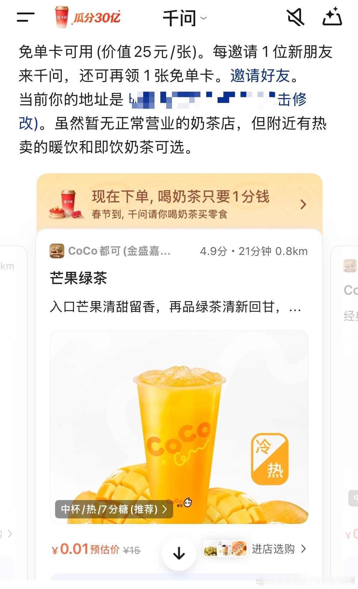 千问免单别问了,问就是千问发福利啦!30亿请大家吃喝玩乐,都不用四舍五入,直接白嫖免费奶茶!下载使用千问app点单,评论,抽五位粉丝宝宝带下单截图找我报销你的奶茶~