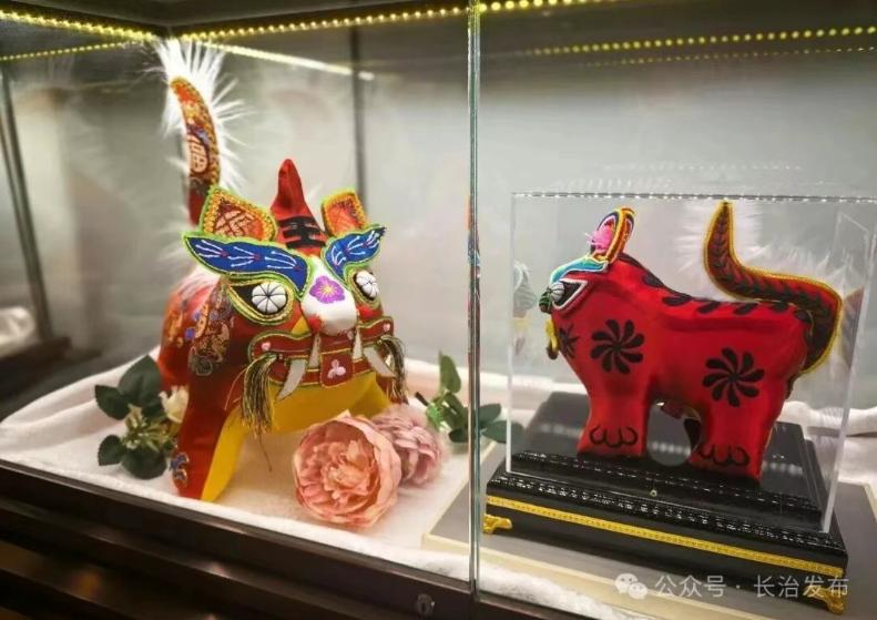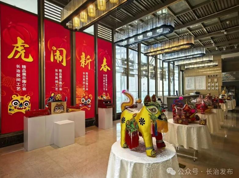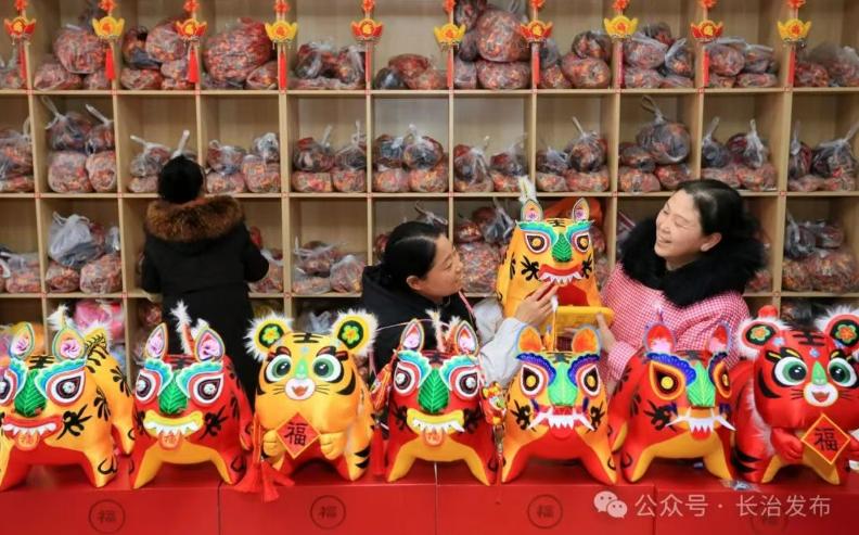 近日,“福虎闹新春·贸促链四海”长治民间工艺精品展示推介会现场暖意融融、人头攒动。展厅内,憨态可掬的黎侯虎成为全场焦点,其精巧针脚与别致纹样引得群众驻足端详;货架上,挂饰、摆件等黎侯虎文创产品琳琅满目,好评如潮。
