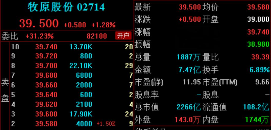 截至发稿,牧原股份港股上涨1.28%,报39.5港元/股,市值超2260亿港元。
