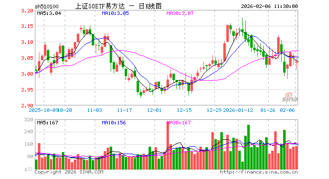 2月6日,截止午间收盘,上证50ETF易方达(510100)跌0.59%,报3.037元,成交额4.49亿元。上证50ETF易方达(510100)重仓股方面,贵州茅台截止午盘跌2.68%,中国平安跌0.88%,紫金矿业涨0.27%,招商银行跌0.65%,兴业银行跌0.27%,长江电力跌0.56%,寒武纪跌1.14%,中信证券跌0.39%,恒瑞医药跌0.77%,工商银行跌0.55%。