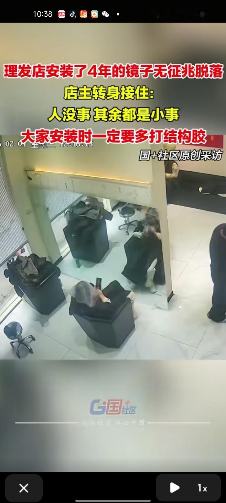 2月4日,临沂市郯城县。理发店安装四年的镜子毫无征兆的掉落,店主看到后眼疾手快用手扶住了,所幸人都没事,其它都是小事。店主称,大家安装镜子是要多打结构胶。